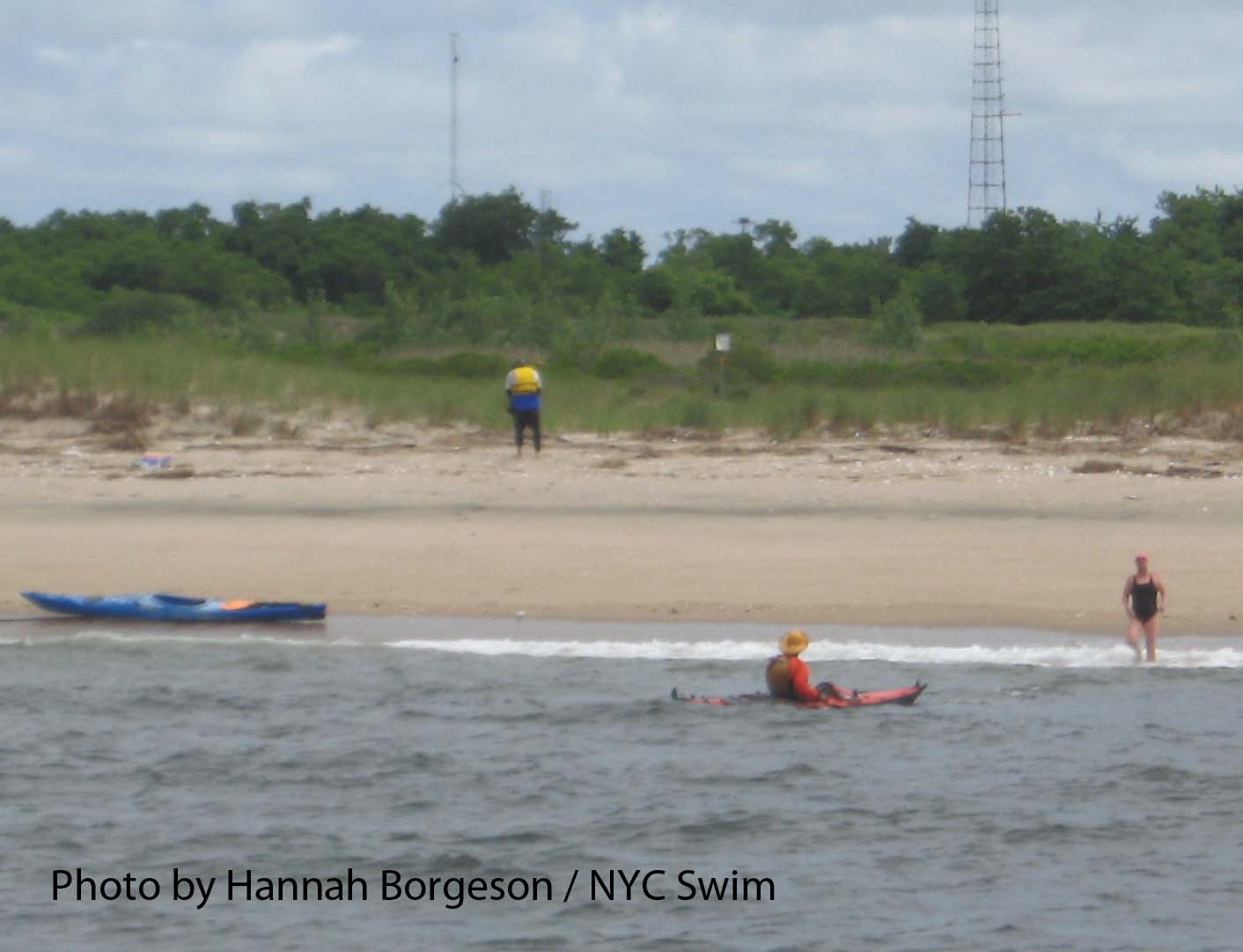 8. (2:44 p.m.) Sandy Hook!! Liz steps up on the beach after 4 hours, 59 minutes, and 6 seconds, breaking the Manhattan to Sandy Hook record, set in 2006 by Tammy van Wisse of Australia, by 7 minutes. I am so thrilled that I completely forget to take a picture, but a blurry record of the moment does exist: