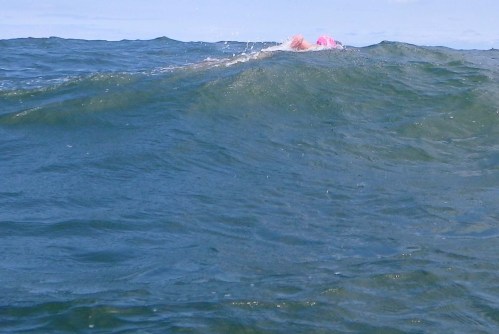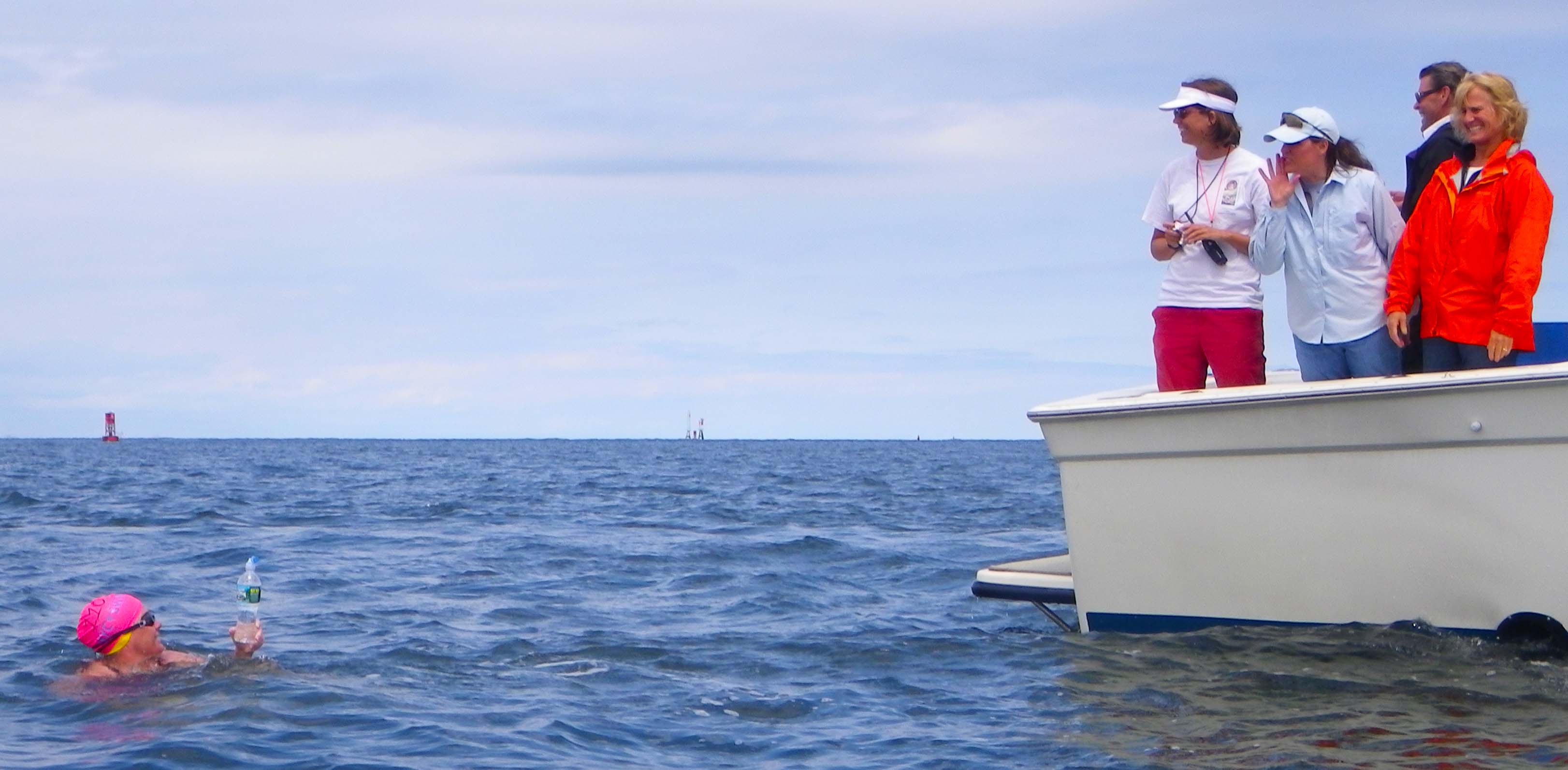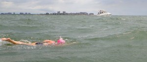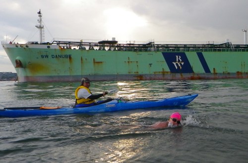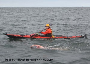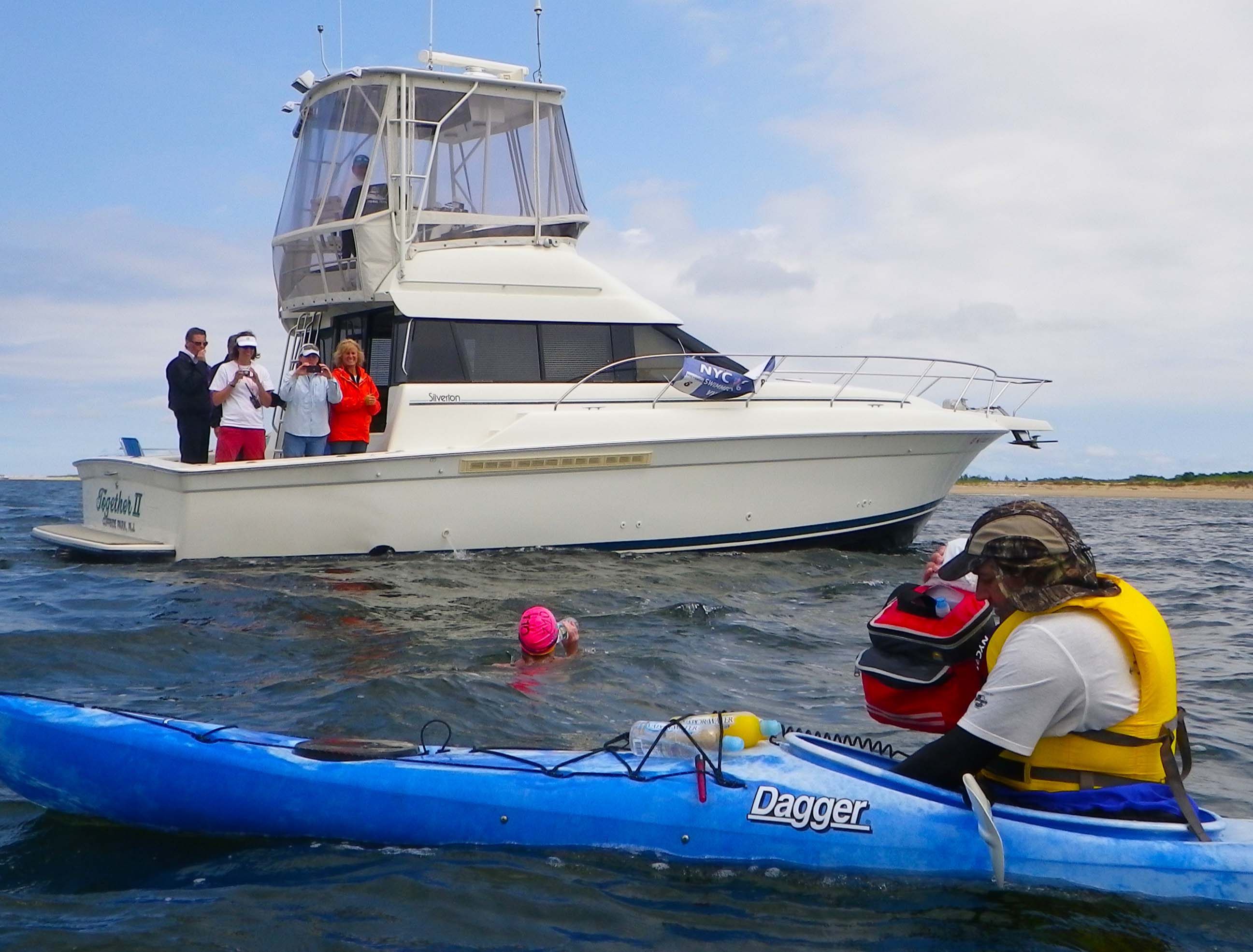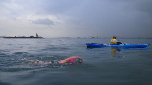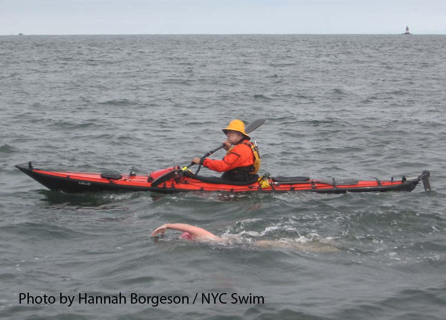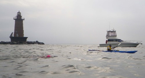 I was one of the two kayakers who accompanied Liz as she completed this  feat. Here’s the swim from a kayaker’s perspective: