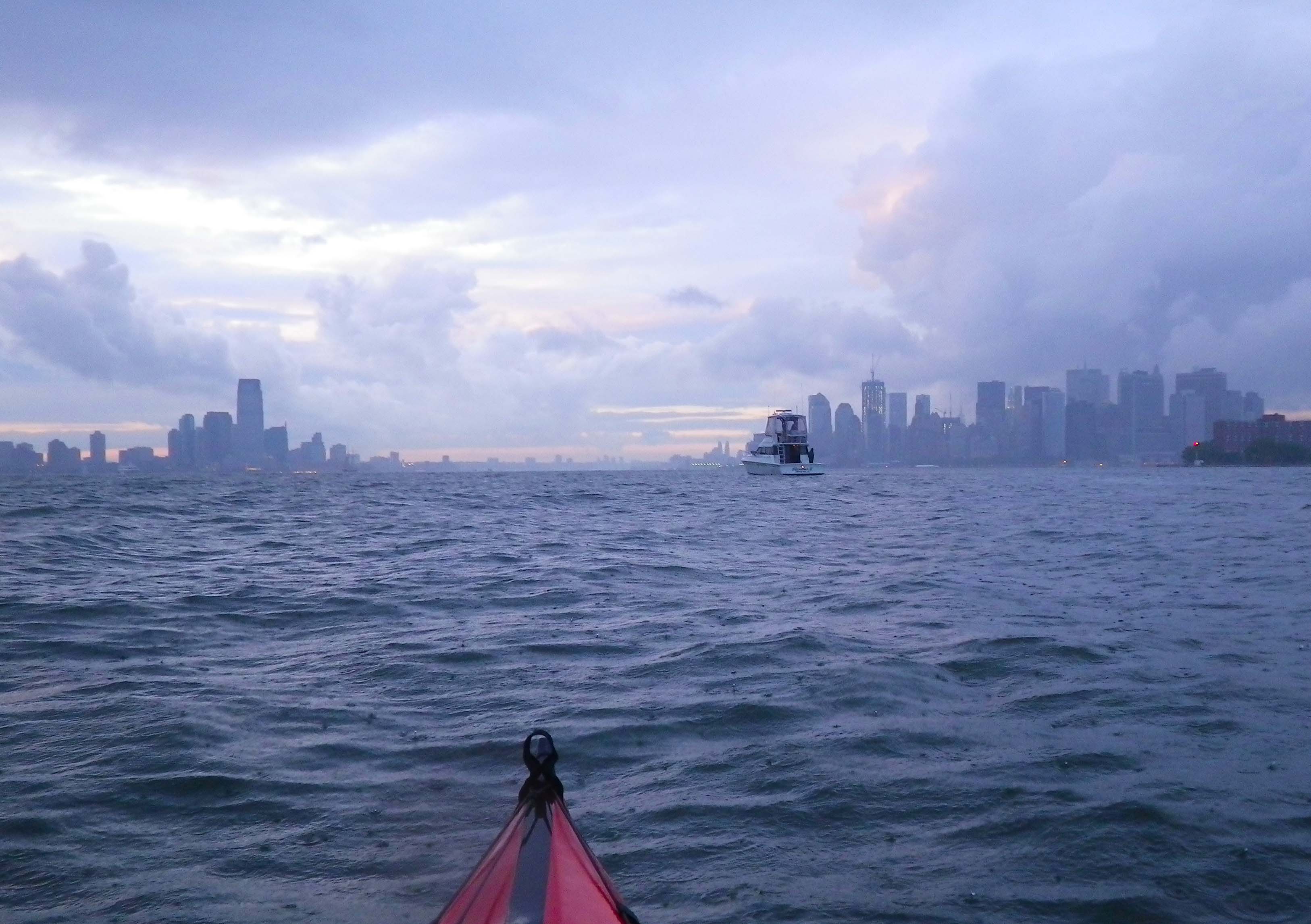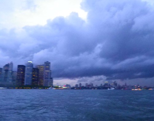 14. (~8:15 p.m.) A brief rain shower, then clearing over the Manhattan skyline that has been teasing us for an hour, growing ever so slowly larger.