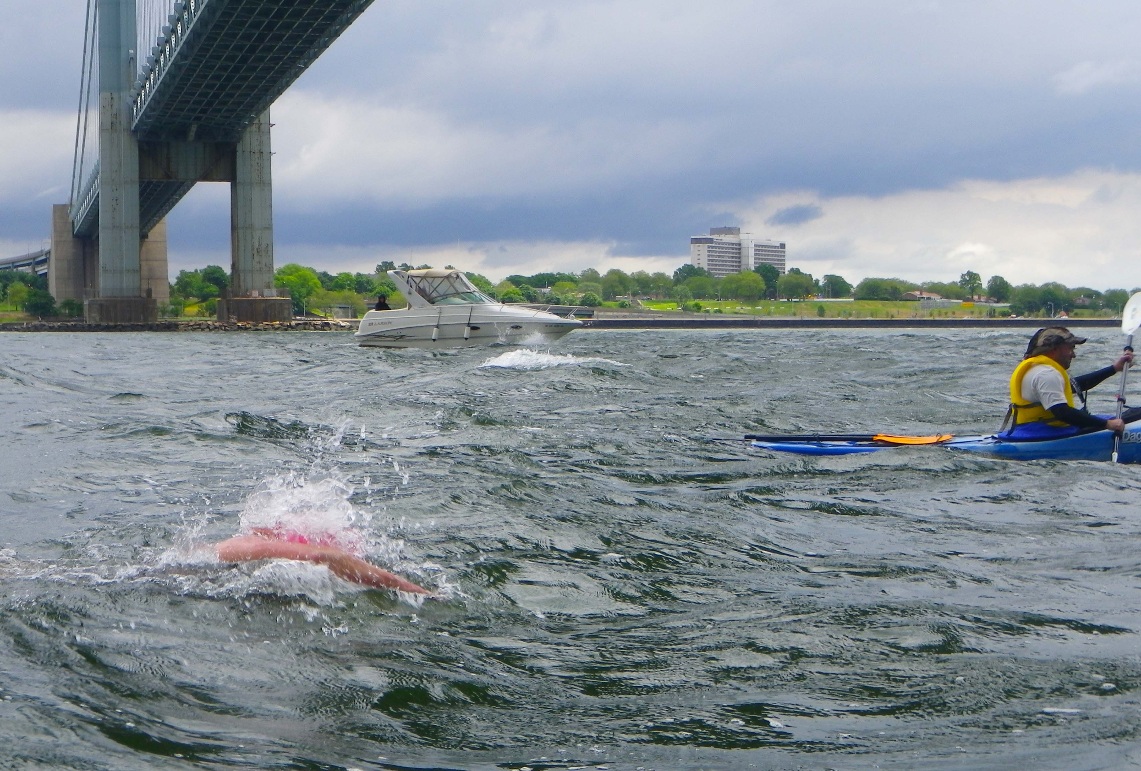 4. (~11:45 a.m.) After 2 hours, we are closing in on the Verrazano-Narrows Bridge while diagonally crossing the channel from the Brooklyn side to the Staten Island side. The ebb current’s boiling,  and we’re flying at 5 mph. From the support motor boat, the Together II, Morty Berger remarks on the radio, “That’s the fastest she’s going to be moving all day, right here.” (He was right).