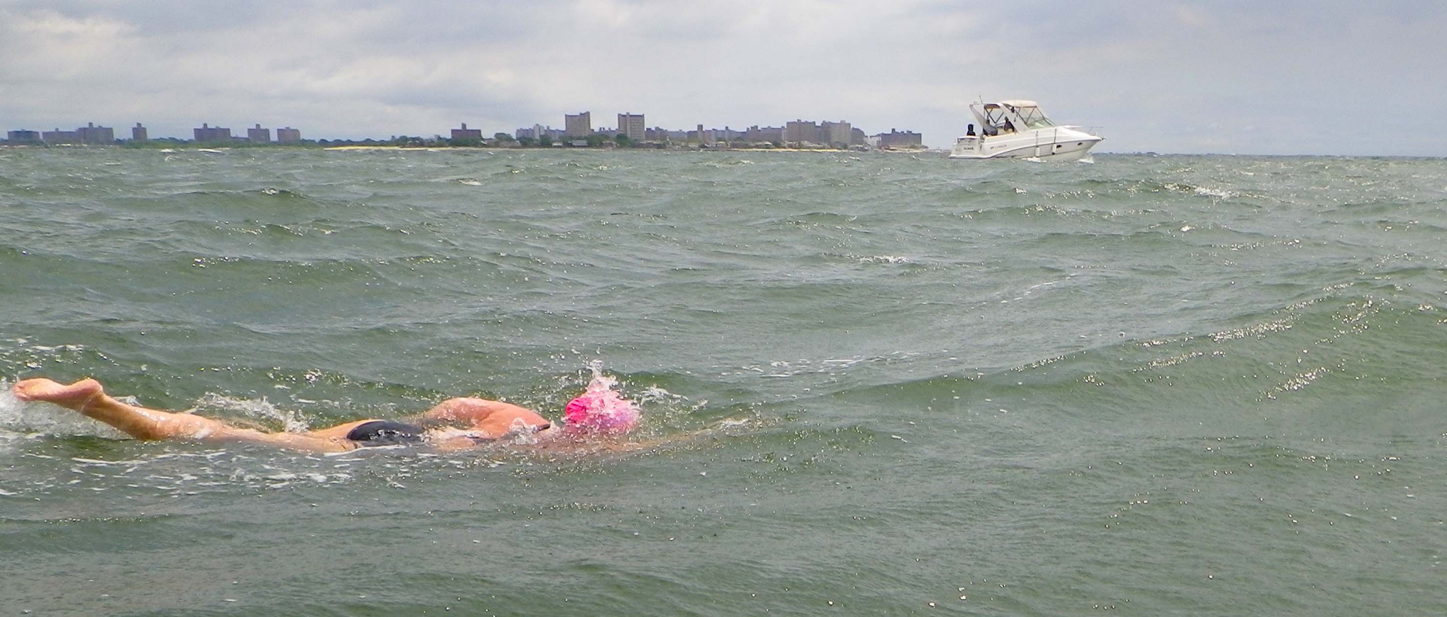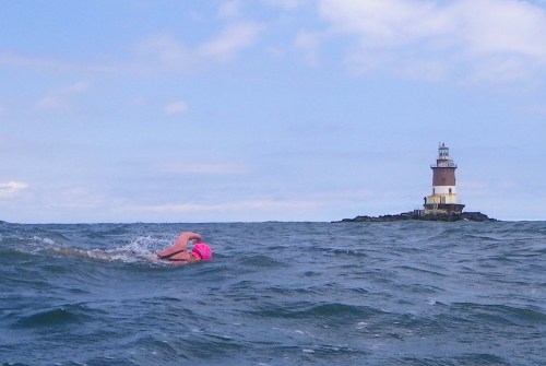 In October 2010, Liz Fry swam in NYC Swim‘s Ederle Swim, a 17.5-mile tide-assisted swim through New York Harbor from Manhattan to Sandy Hook, New Jersey.  Yet when she reached Sandy Hook, she wasn’t all that tired. As all the swimmers were getting onto their accompanying motor boats to return to Manhattan, Liz thought to herself, “Isn’t the tide soon going to turn back toward Manhattan again? Why don’t I just swim back?” And so in 2011 she did.