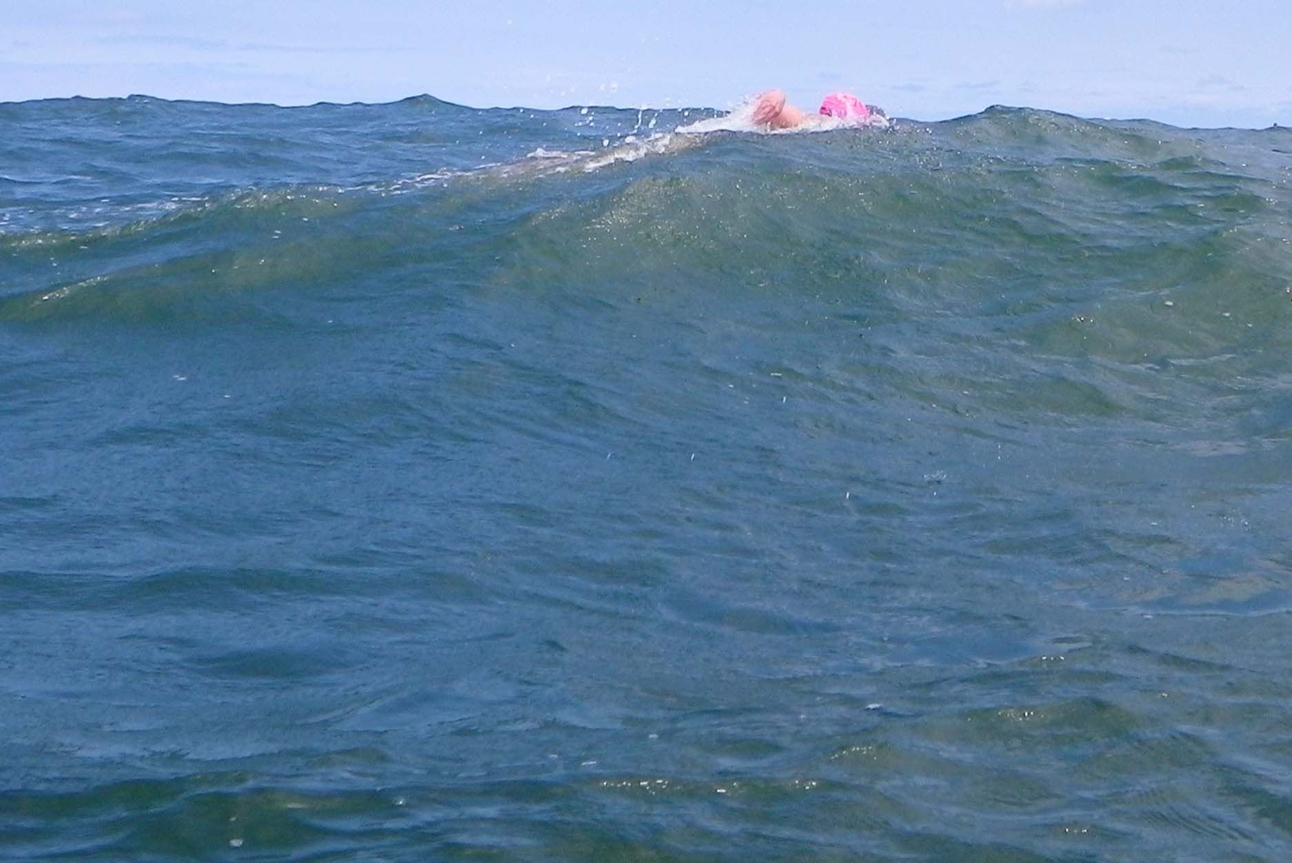 I look at my watch. The beach is close, but so is the record time that Liz has to break. It would take too long if she were to angle into the current to counteract its effect. So I allow her to be carried west while swimming directly for the beach. I hear no complaints on the radio from the Together II, so they’ve presumably made the same calculation. It’s down to the wire!
