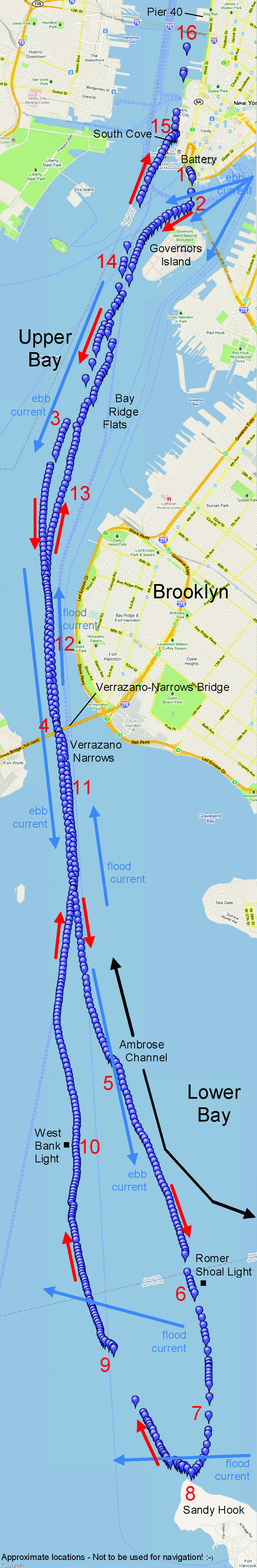 I believe you are swimming in the one-way Ederle in October? That is less complicated, current-wise, because it’s possible to pick the start time so that the current is optimal JUST for the swim down, rather than compromising so that it’s good enough for both the swim down AND the swim back. Basically, you start a bit earlier in the ebb, so there isn’t the problem with getting round Governors Island, and you arrive at Sandy Hook while the ebb is still pretty strong. Of course, at that earlier stage in the ebb the current tries to sweep you east, out to sea, so that it’s easy to overshoot the tip of Sandy Hook and land somewhere on the eastern side, losing time in doing so….