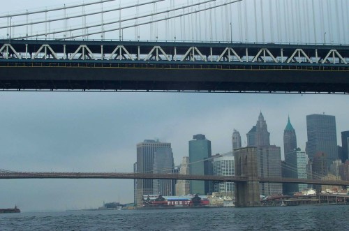 The East River current accelerates me to 7 knots (I have my GPS on deck) and sweeps me, in quick succession, under the Brooklyn and Manhattan Bridges. As I usually do when going with the current, I keep to where the strong current is, well away from shore. In any case, as the sight of a blue police boat on its habitual station under the Brooklyn Bridge reminds me, it is now forbidden to approach close to any piers, bridge abuttments, or other waterside installations—almost any point, it would seem, along much of the shoreline of New York City. Paddling along the shore, it would also be very easy to get tangled up in the often completely invisible lines of the fishermen casting off the piers, and would present an inviting target for rock-throwing children (I have been attacked four times)—another urban paddling hazard they don’t tell you about in kayaking school. Paddling in the channel, however, requires constant alertness. A rapidly gaining ferry, or a tug pushing a huge oil barge, can materialize behind in no time or, worse, suddenly push off from any number of hidden spots to the side. Even from among decayed piers, with loose timbers swaying in the current and trees already established on top, a live tug can suddenly emerge. Practically on every trip, I notice a fresh ferry landing that has sprung up in a previously safe corner.