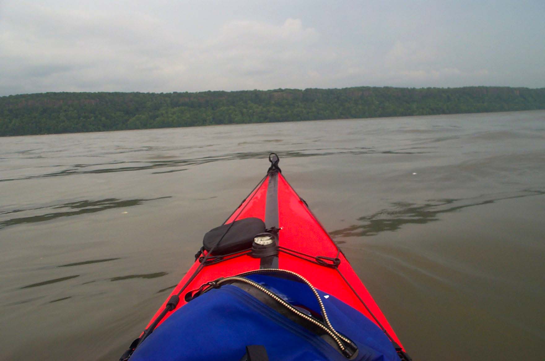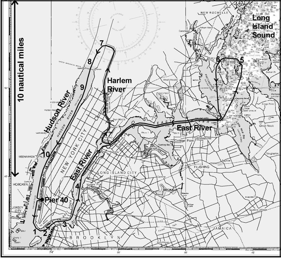 Leaving Pier 40 on the west side of Manhattan, I paddle down the Hudson River to the Battery, the southernmost point of Manhattan. A peculiarity of the currents in this area is that for almost two hours in the tidal cycle the current is still ebbing down the Hudson west of Manhattan but is already flooding up the East River east of Manhattan. (The simple idea that current begins to ebb at high water and flood at low water fails miserably around New York.) This phenomenon will effortlessly sweep the boat round the southern tip of Manhattan.