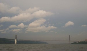 I complete a loop around Hart and City Islands back to Throgs Neck, where I plunge back into the East River. The current has now conveniently turned and within an hour the ebb carries me back to Hell Gate. There I turn right into the Harlem River, still riding the ebb current which here doesn’t flow south as in the Hudson and East Rivers, but north. The Harlem River is an unremarkable narrow, straight-sided canal relieved only by numerous old bridges; unfortunately, from below I can see only too clearly their rusting decay as well as the piles of trash, and here and there encampments of homeless people, along the banks. The end of the Harlem River, however, comes rewarded with a sight that always momentarily takes my breath away. After more than an hour in the narrow confines of the Harlem River, and finally passing under a low railroad bridge that obscures sight until the last second, I burst out into the broad expanse of the Hudson. A mile across the river, the unbroken green of the Palisades stretches north into the distance. Often an orange setting sun completes the picture. Facing west here, one can almost believe that things are still as they were a thousand years ago.