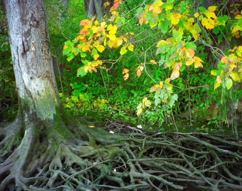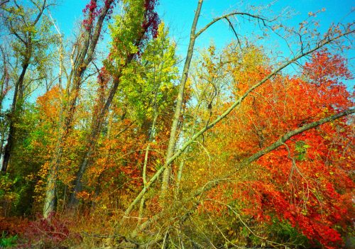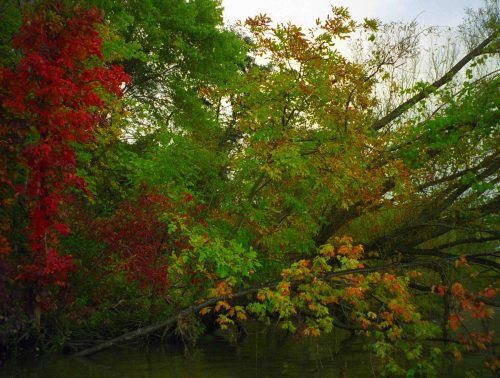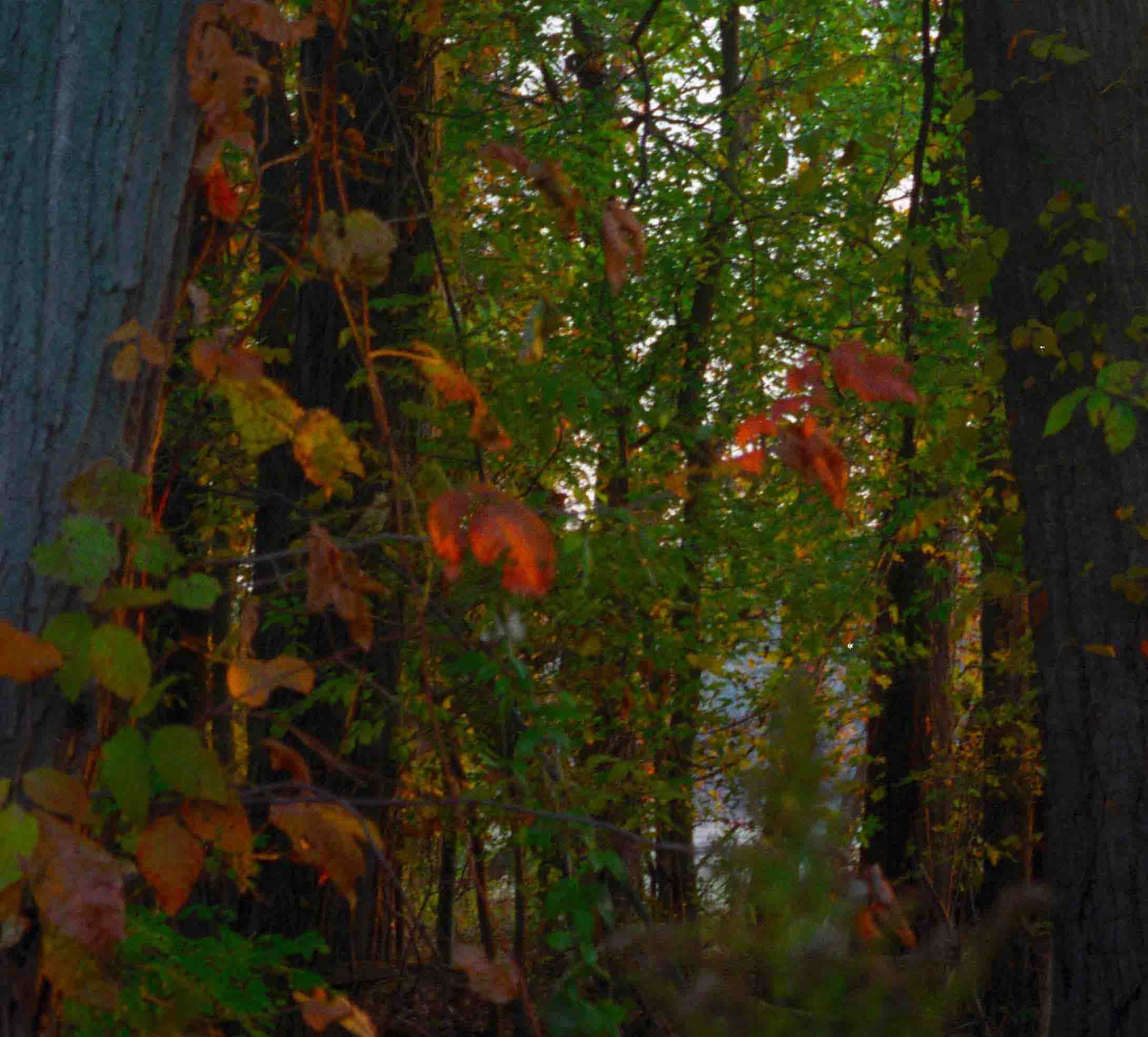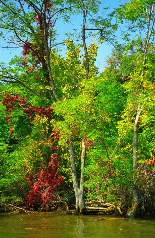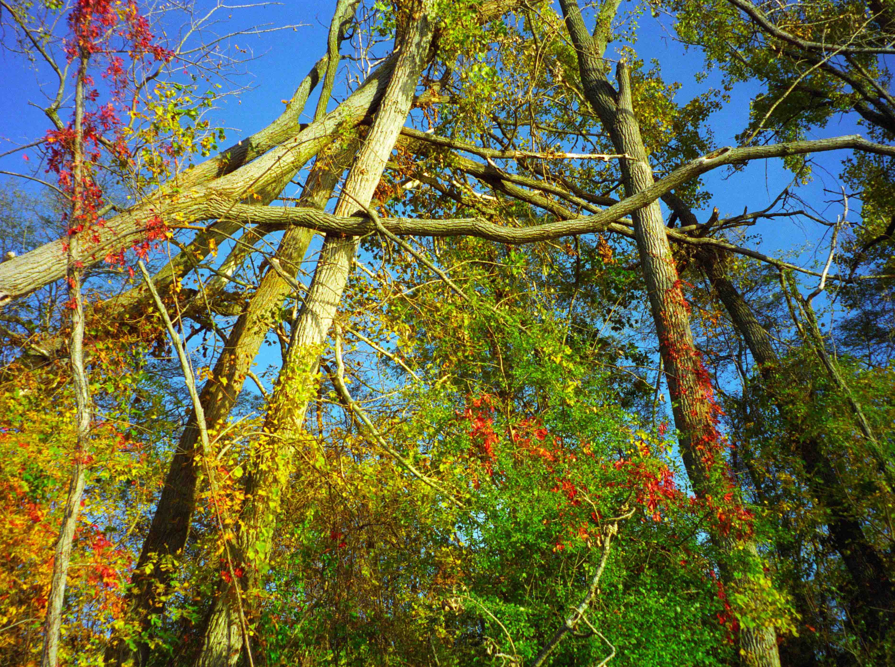 But what most catches the eye in the early fall are the brilliant reds of the vines draped here and there over the trees