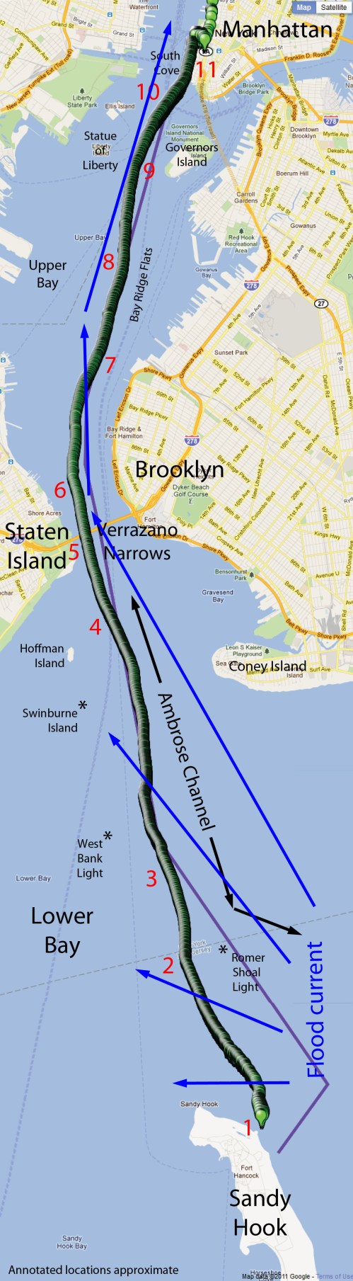 But she was swimming directly north! Off the tip of Sandy Hook, the tidal current floods from east to west, and it starts early, while the current elsewhere in the harbor is still ebbing. Indeed, there was already strong westward current across the tip of Sandy Hook… The plan had been, therefore, to swim (as shown by the purple line on the map above) at first sharply to the northeast to counter this current and reach, hopefully, water where the flood current had a more northerly component.