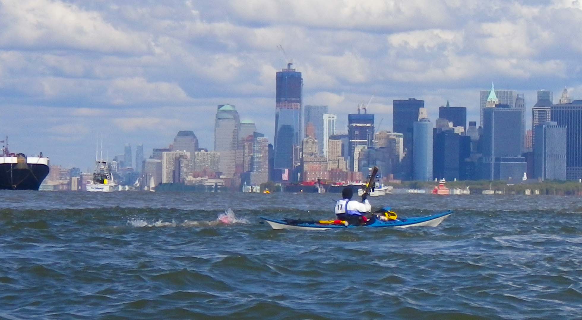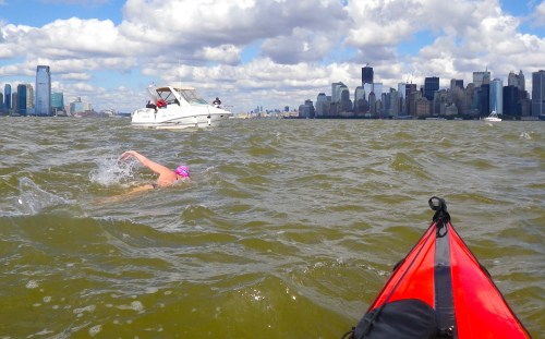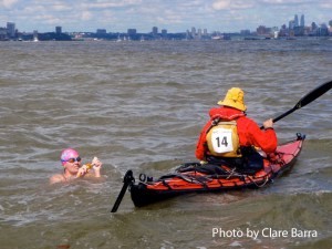 This time I was the kayaker for Janet Harris, in her very first Ederle Swim. Here are some annotated photos from my kayaker’s perspective. Janet has posted her own account of her swim here.