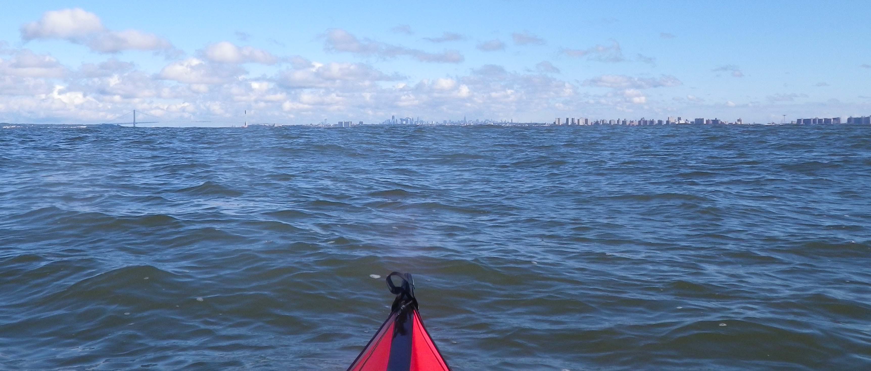 3. All around, there was just endless water, clear and sunlit looking down but becoming deep blue into the distance, with here and there a lone white motorboat. Above, a blue sky, with scattered clouds not yet blocking the warm sunshine. The visibility was tremendous. Far ahead, tiny on the horizon, was the Verrazano-Narrows Bridge, and beyond that, Manhattan. This truly was open water!