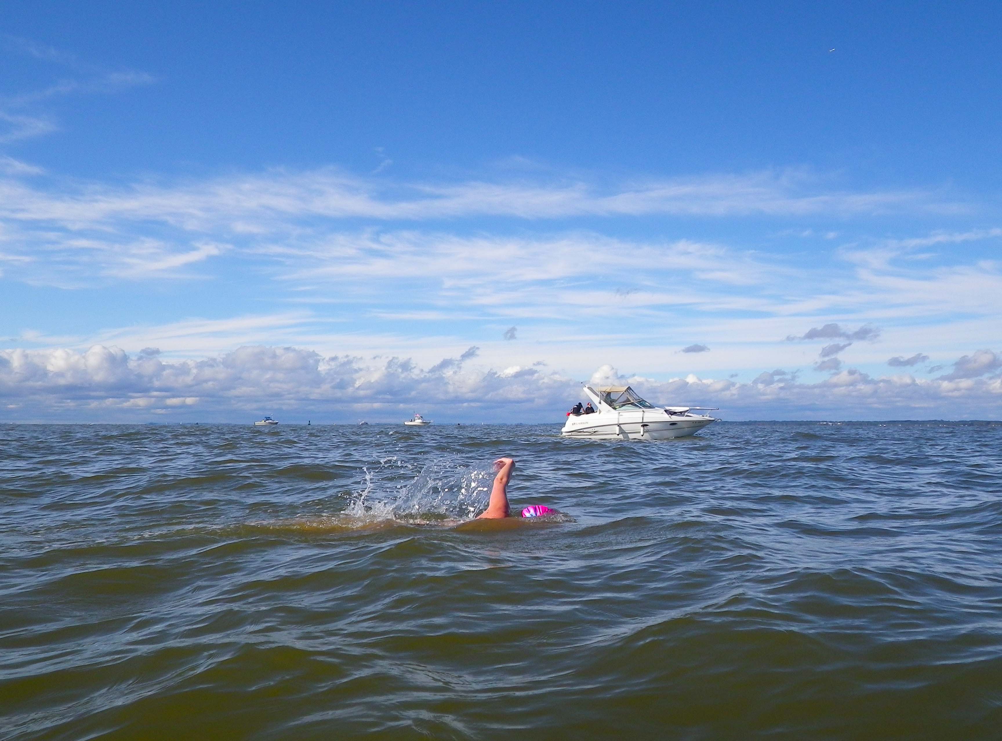 If I had been with Janet right from the start, we might have done more of that. Many other swimmers did. I could see them—their motorboats gleaming white in the sun, their colorful kayaks, and beside them, sometimes even a tiny purple dot splashing in the blue water—far to the east. On the other hand, other swimmers had failed, or had not tried, to counter the current and were now far to the west. Soon after leaving Sandy Hook, the field was spread over a huge expanse of water.
