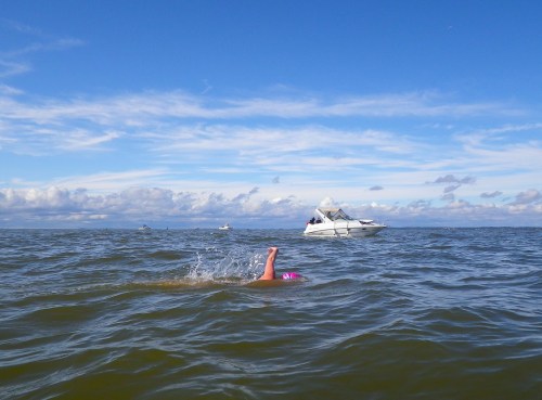 The motorboaters, even if they have experience of the local waters, tend to overestimate what can be done, since they are accustomed to having plenty of power at their disposal. Bonnie Frogma, in her writeup of the swim with Capri Djatiasmoro, writes: “I think the main problem with the motorboat running things is that he actually has a hard time gearing his perceptions of possible courses down to the speed of a swimmer … our skipper kept asking me to take her to the right of things that I already knew we were going to be passing on the left – the course he was laying out was a good one, we just didn’t have the speed to achieve it.” That’s been my experience too.