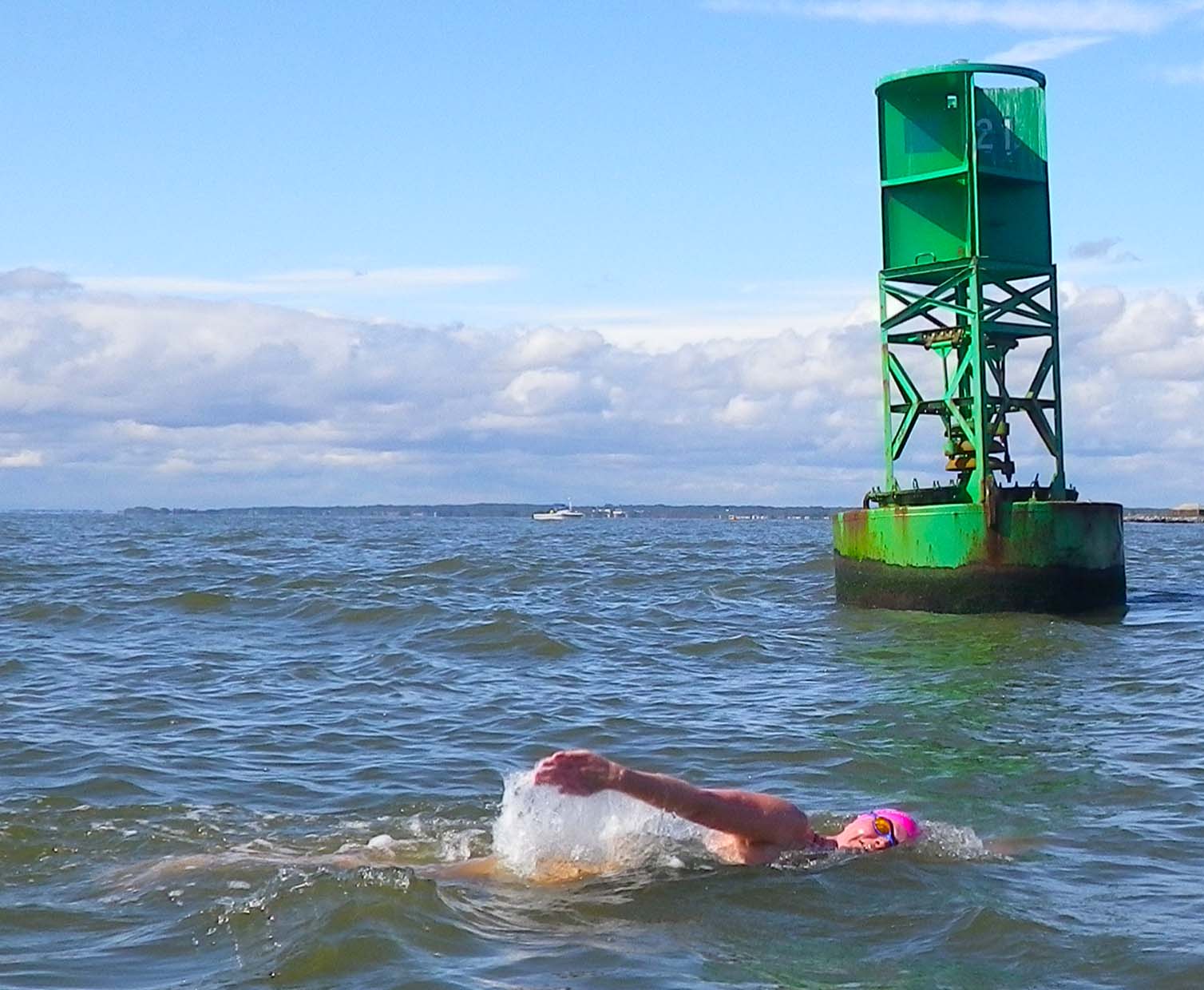 2. So we found ourselves pushed west by the current, and passed Romer Shoal Light at some distance to the west of it, not close by as planned. But we did angle into the current to minimize the westward drift—it was necessary to continue to do that almost the whole way through the Lower Bay—and steer a middle course between the swimmers to the east and west of us.