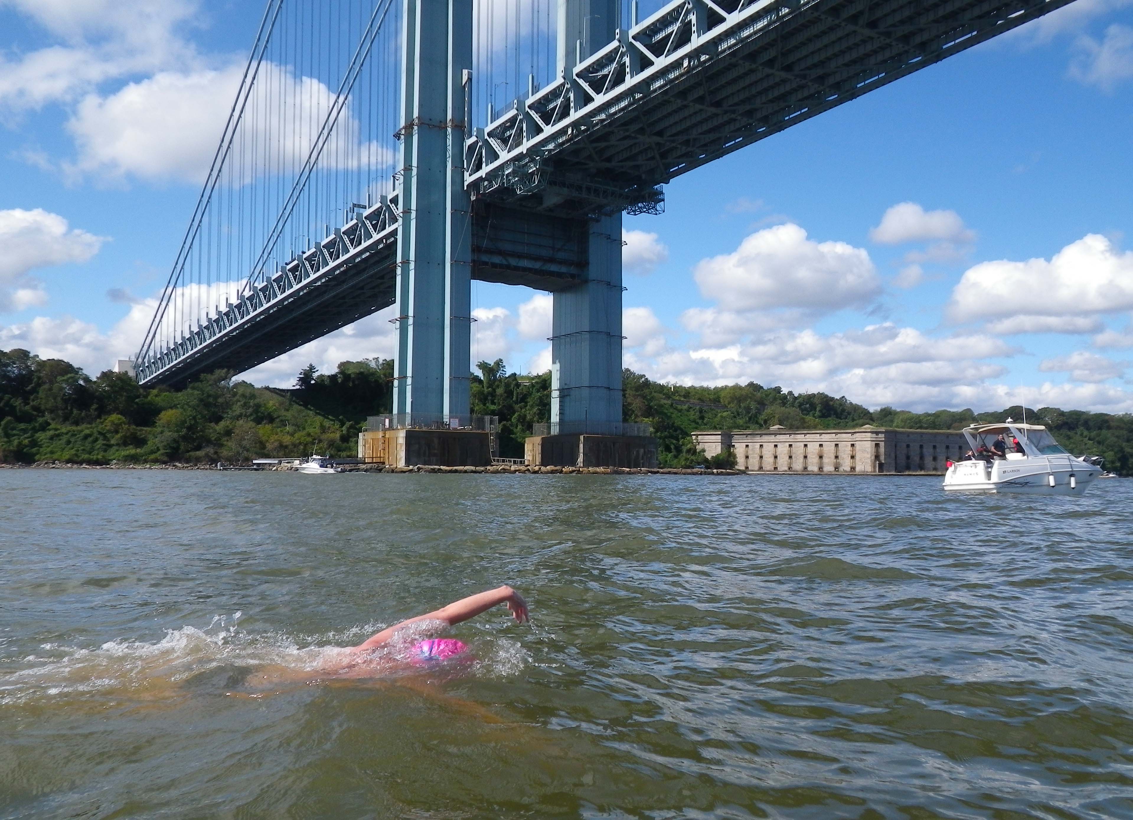 5. Now it was on to the Verrazano-Narrows Bridge. It had been in sight from the start of the swim, across the whole of the Lower Bay, getting bigger only frustratingly slowly. But finally we reached it! I saw Janet swim on her back and look up at the underside as we passed under it.