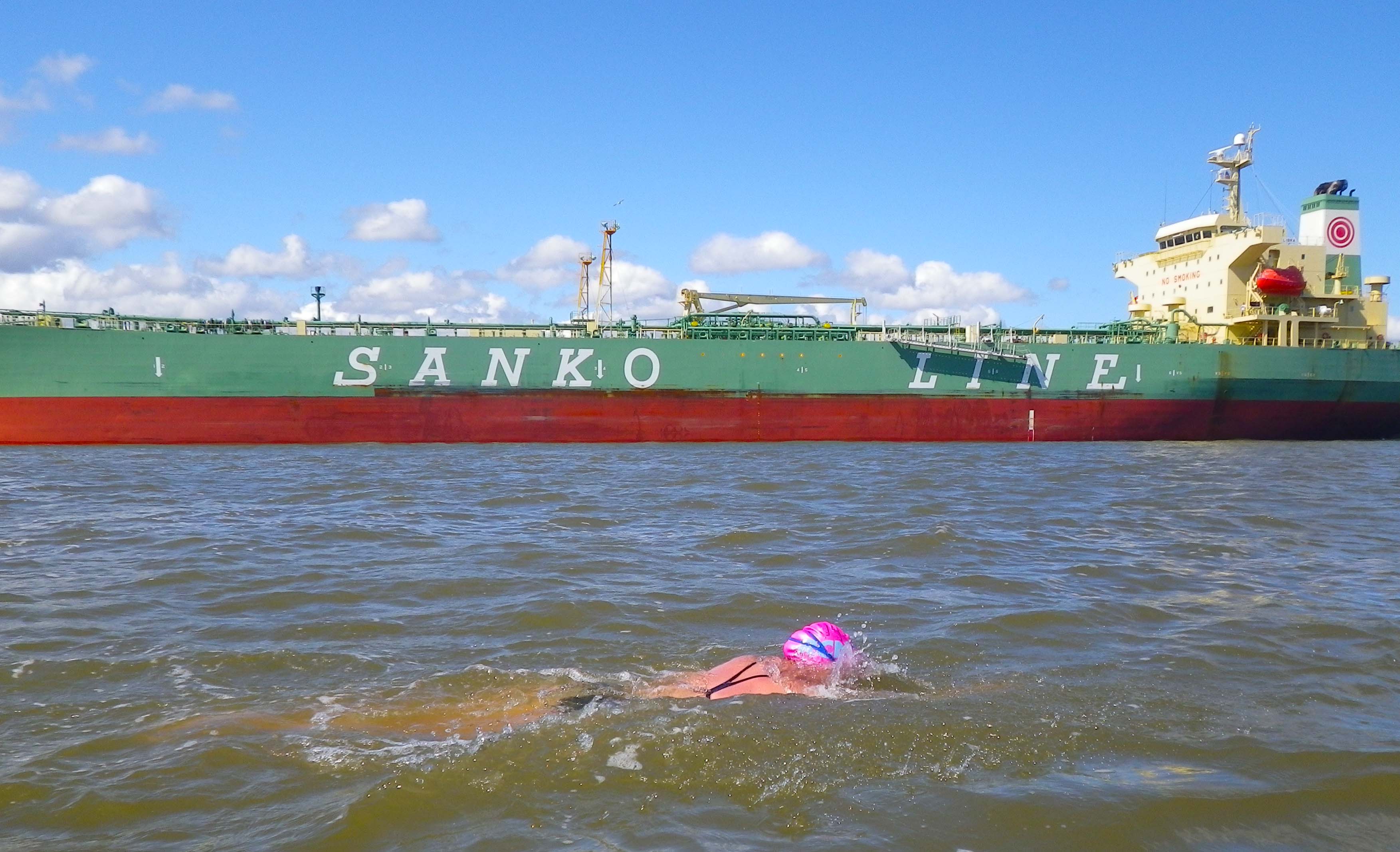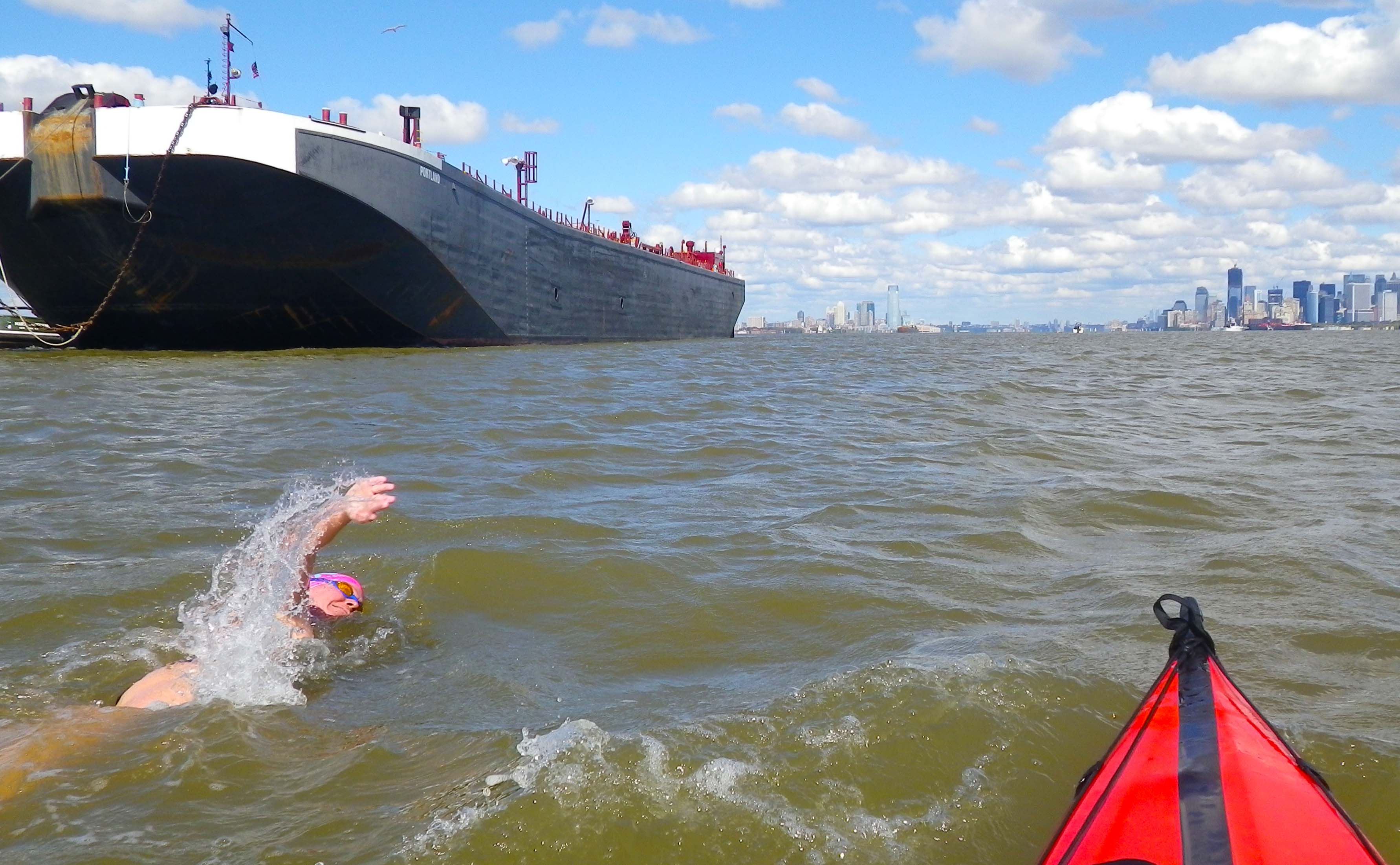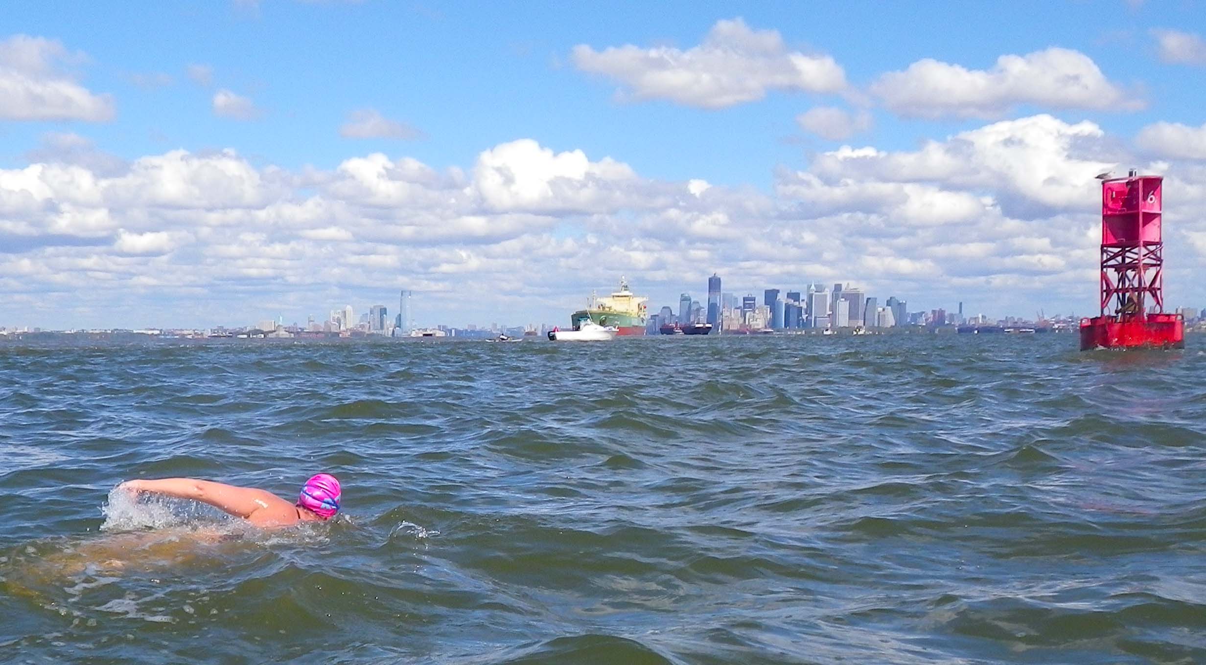 Passing by big cargo ships is really cool, and I got to swim right next to a couple that were anchored. They’re so huge! I kept thinking, where else would I get to share the water with these monsters? It made me appreciate the fact that I was swimming through NYC harbor.