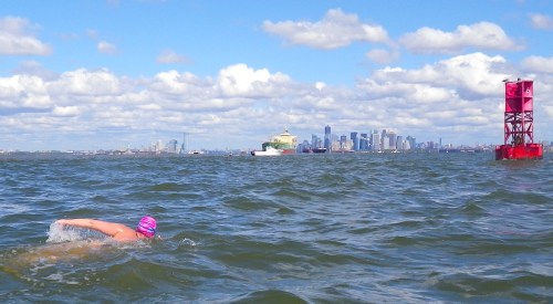 And now, Round Three! Last Sunday we had the main, yearly Ederle Swim for multiple swimmers—19 swimmers started—but in the other direction, from Sandy Hook to Manhattan. The winner of this race was looking to beat Liz’s other individual record!