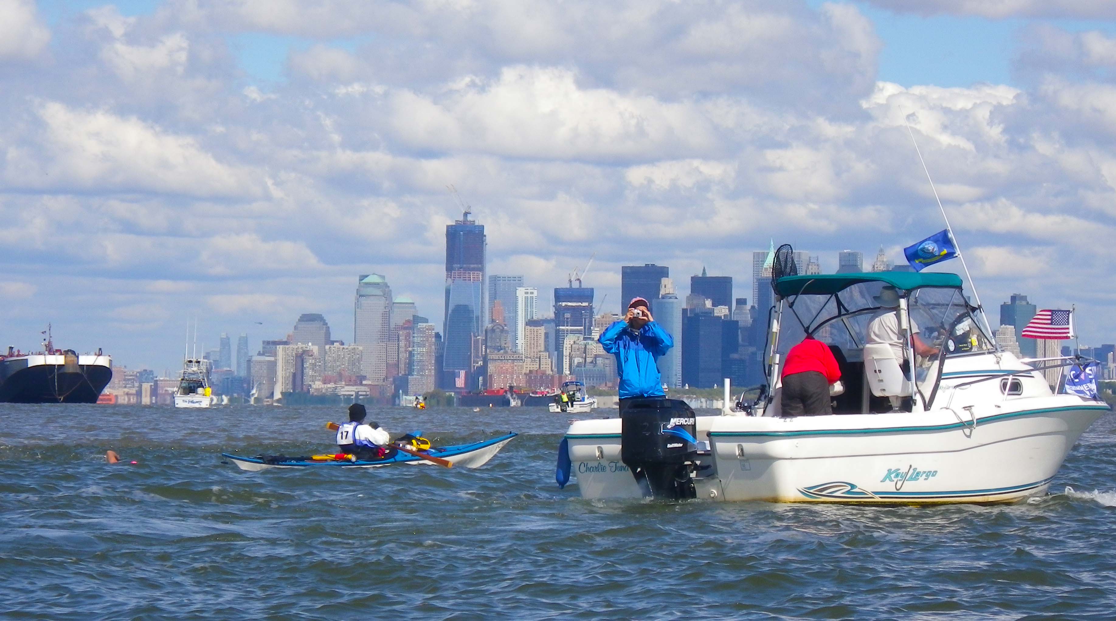 10. Now only the crossing to Manhattan remained. The water between Governors Island and the Battery was rough—a number of swimmers complained of it—due to an increasing southerly wind and the rebounding wakes from the dense boat traffic criss-crossing this area, some of which the M & M II had to intercept and head off.