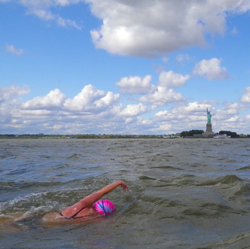 … the entire time I was also constantly taking in and loving everything around me—the blue-and-puffy-clouded sky, the undulation of the waves, the feeling of being surrounded and supported by the water. I waved to the Romer Shoal Lighthouse and the Statue of Liberty as I passed by, blew a kiss to the VZ bridge as I backstroked under it, and was excited by the ever-nearing skyline of Manhattan. The whole swim was simply joyful, and was the kind of peak athletic experience where the more energy I expended, the more I felt like I had to give.
