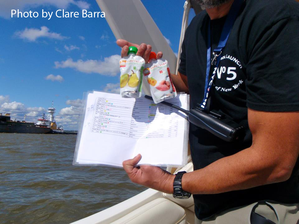 Where the waters met, there was a striking, unusually well-marked boundary—such as we’ve seen throughout New York Harbor ever since Hurricane Irene—between the clear blue ocean water and the muddy, yellow-brown Hudson River water.  (The boundary is clearly visible in the two photos above.) Trapped all along the boundary were floating logs, tree branches, plastic bottles, and other debris that Janet had to swim through carefully. In her account of the swim, Janet comments: