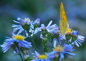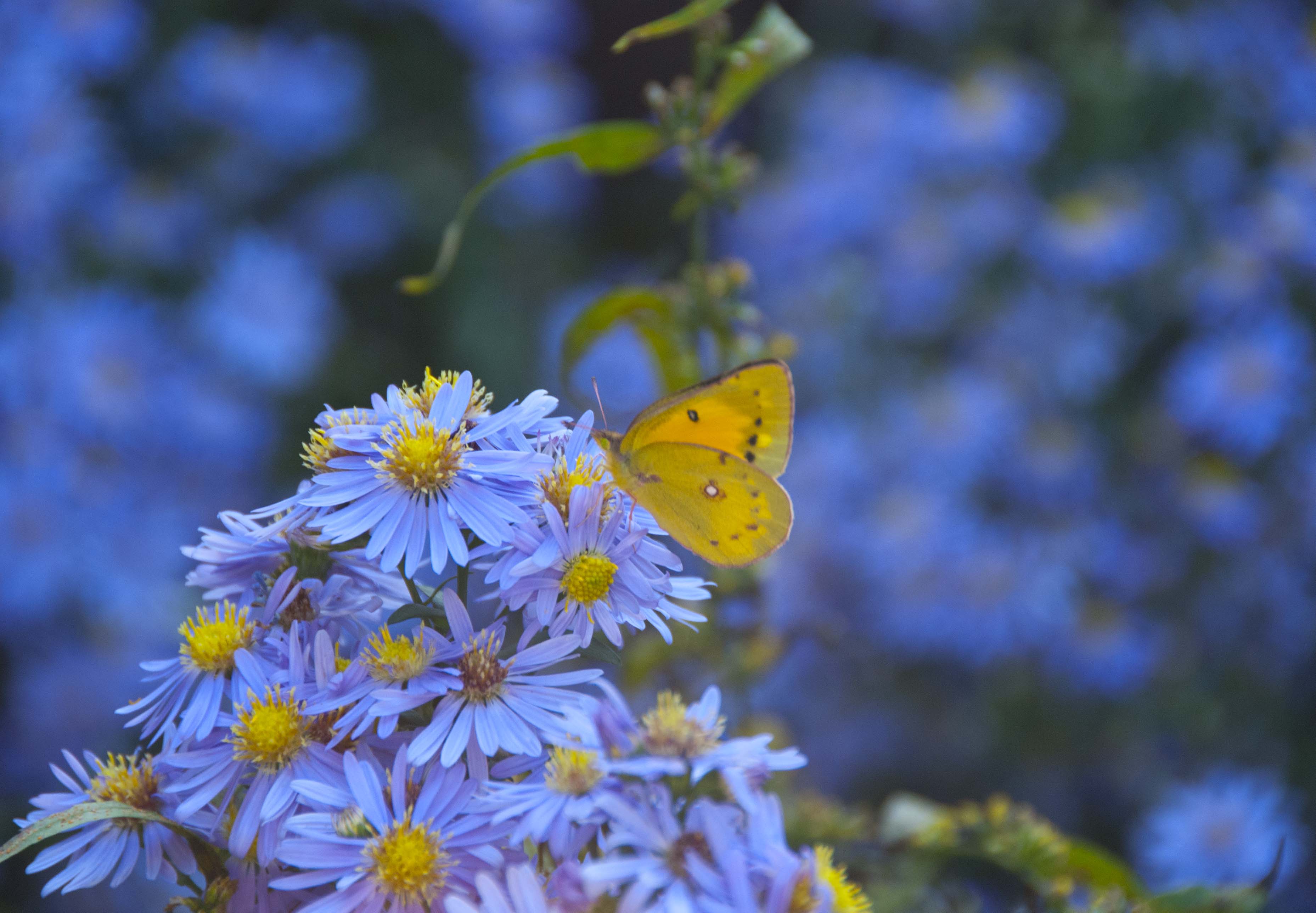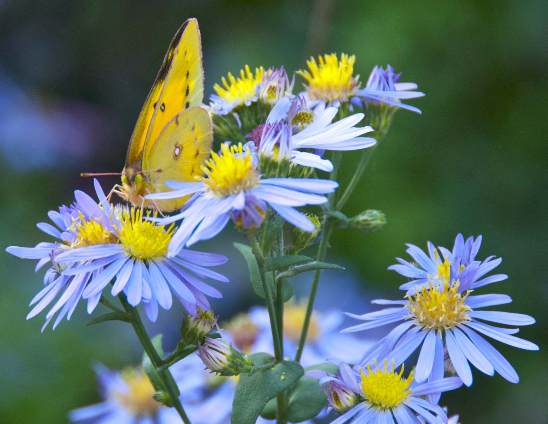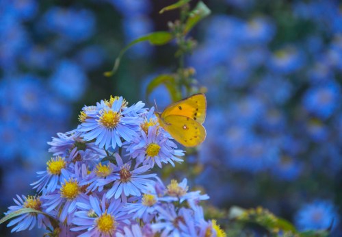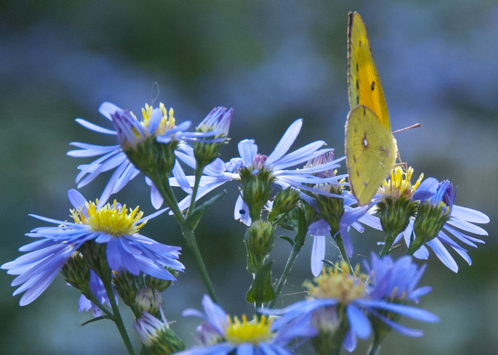 and an impossibly beautiful Cloudless Sulphur with green eyes in the floral blue.