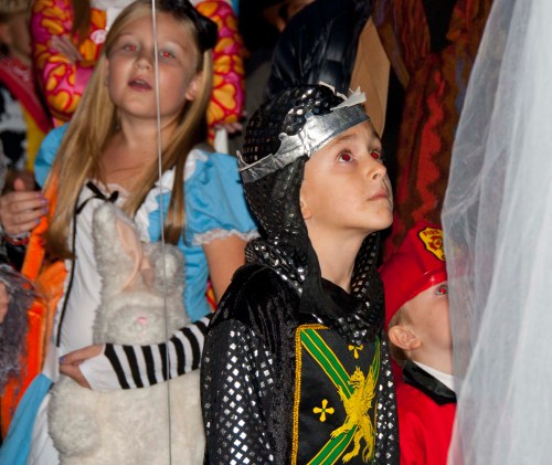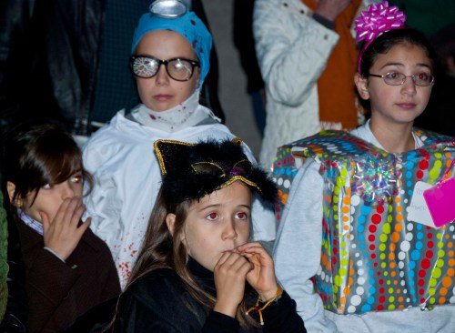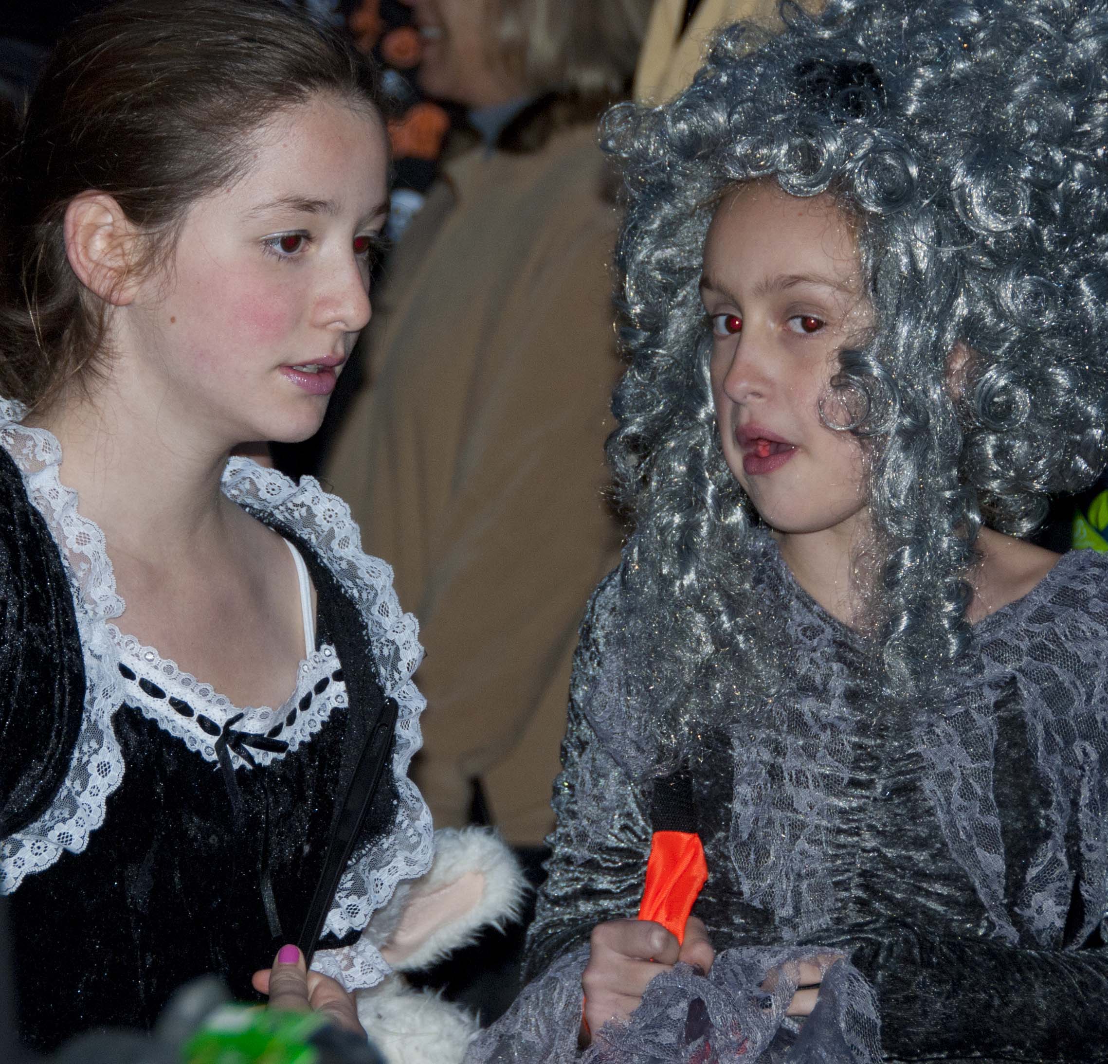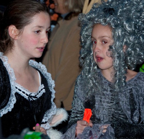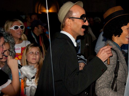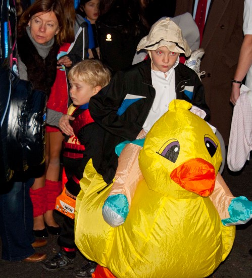 It was mostly for children. Little ghosts, goblins, skeletons, witches, dragons, tigers, superheroes, knights in armor, princesses, pumpkins, bananas, cobwebbed barrels and even tubs of popcorn, some young enough to be held in arms by their parents who clearly were having just as much fun, cavorted in the street. A little later there was a tiny parade, and prizes were awarded for best costumes. Then, the main business of the evening: trick-or-treating from house to house. Many houses in that block have for days been festooned with their own cobwebs, giant black spiders, and grinning skeletons in anticipation.