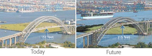 But now the Panama Canal is being widened. When the widening is completed—very soon, in 2014—a new generation of post-Panamax ships will roam the world. These larger ships will go wherever ports can accommodate them. And right now, because these ships can’t fit under the Bayonne Bridge, this won’t include New York’s main container terminals in Port Newark / Elizabeth.