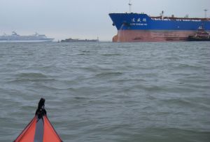 At that point Johna picked up the radio and said, “Captain, this is the kayakers, we’re waiting for you to go by. We’re staying out of your way.”