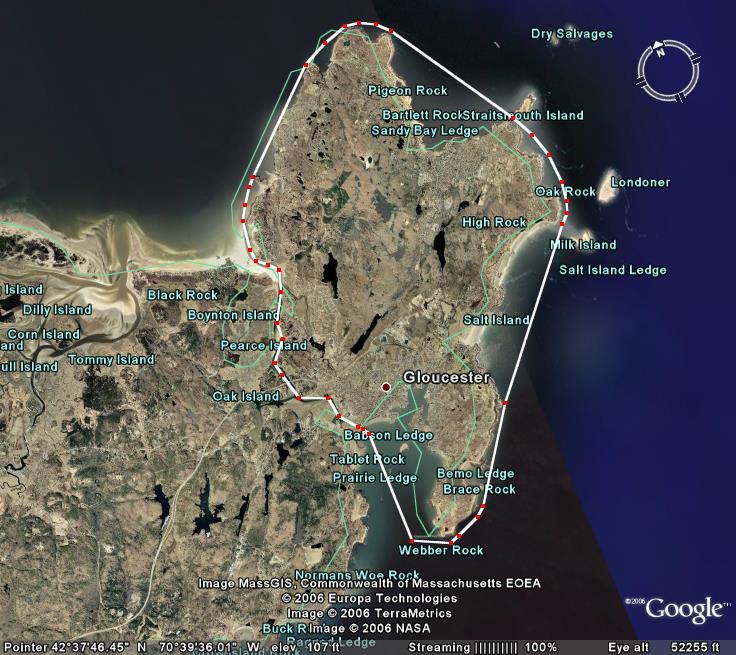 The course is (almost) a circumnavigation of Cape Ann—for the first two or three miles down the winding Annisquam River, and then past a series of rocky points around the cape, ending in Gloucester Harbor. There is some assistance from tidal current, especially in the Annisquam River. After that, “conditions can vary dramatically throughout the day. Occasionally the water can be very rough, with strong winds and high waves.” The 2006 race was run in thick fog (after which, provision was made for alternative courses to be used in fog or high winds, but I don’t think they’ve been needed yet). In the past two years, conditions have been fairly placid—but even then, as we rounded some of the points we were treated to the sight and sound of surf crashing dramatically on the rocks, just to show what could be!
