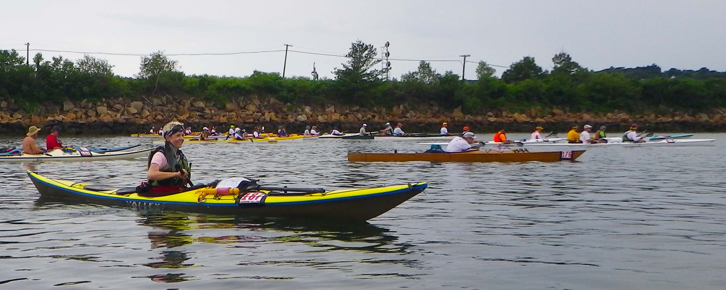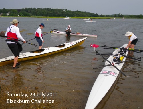 The Blackburn Challenge, organized by the Cape Ann Rowing Club, is a ~20-mile open water race around Cape Ann, the rocky cape that projects into the Atlantic Ocean north of Boston, Massachusetts. It’s a well known and well established event—last year was the 25th running of the race (and there was one participant who had been in all 25 of them!). The fun part is that the race is open to “all seaworthy oar or paddle powered craft. Classes include men’s and women’s Banks dories, fixed seat singles, doubles, multi-oars with cox, multi-oars without cox, sliding seat singles & doubles, single & double touring kayaks, single & double racing kayaks, surf skis, and outrigger canoes.” Even, in the last couple of years, paddleboards! So it’s quite a colorful flotilla out there on the ocean during the race!