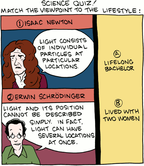 If Wikipedia didn’t write more about Shroedinger’s love life, it’s because he had a boring one. He may have lived openly with two women, but that doesn’t mean he was good at sex, terribly interested in it, or even a sensitive guy. Why write about his relationships if they weren’t that important to him? Just guessing. I know nothing about Shroedinger’s personal life. I’m still trying to figure out the cat in the box thing.