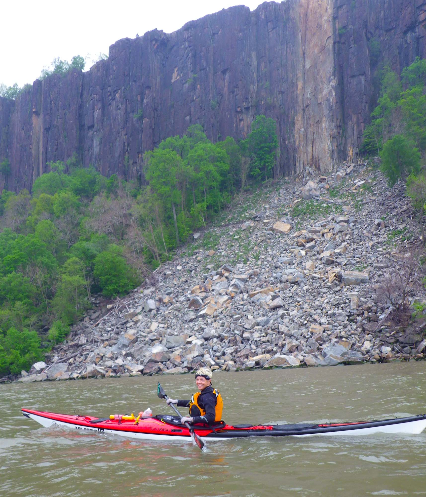 We paddle back, past the large rockfall that last summer blocked the Palisades hiking path
