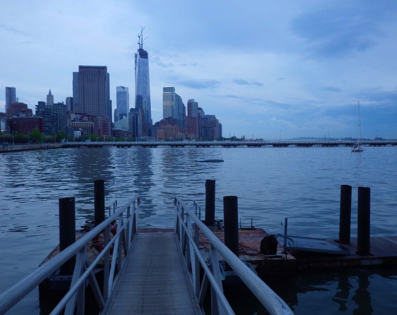 From Pier 40, we look across at the new World Trade Center tower, now almost complete with its spire installed