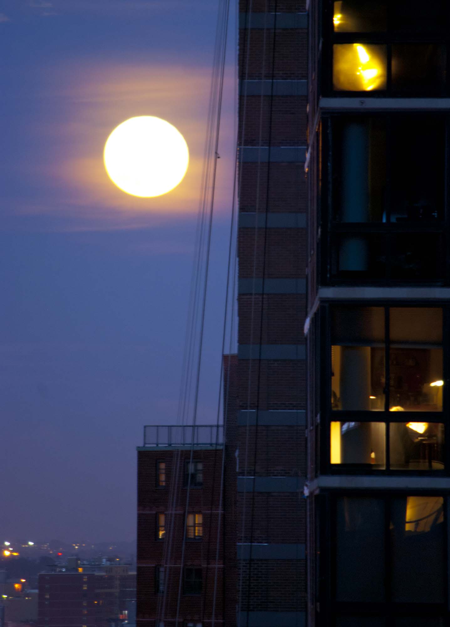 But our view of the horizon is by no means complete. There are quite a few tall buildings around ours that block the view. Would the moon rise behind one of these, or in a gap between them? I suppose we could have gotten out the compass… But we preferred to wait and be surprised.