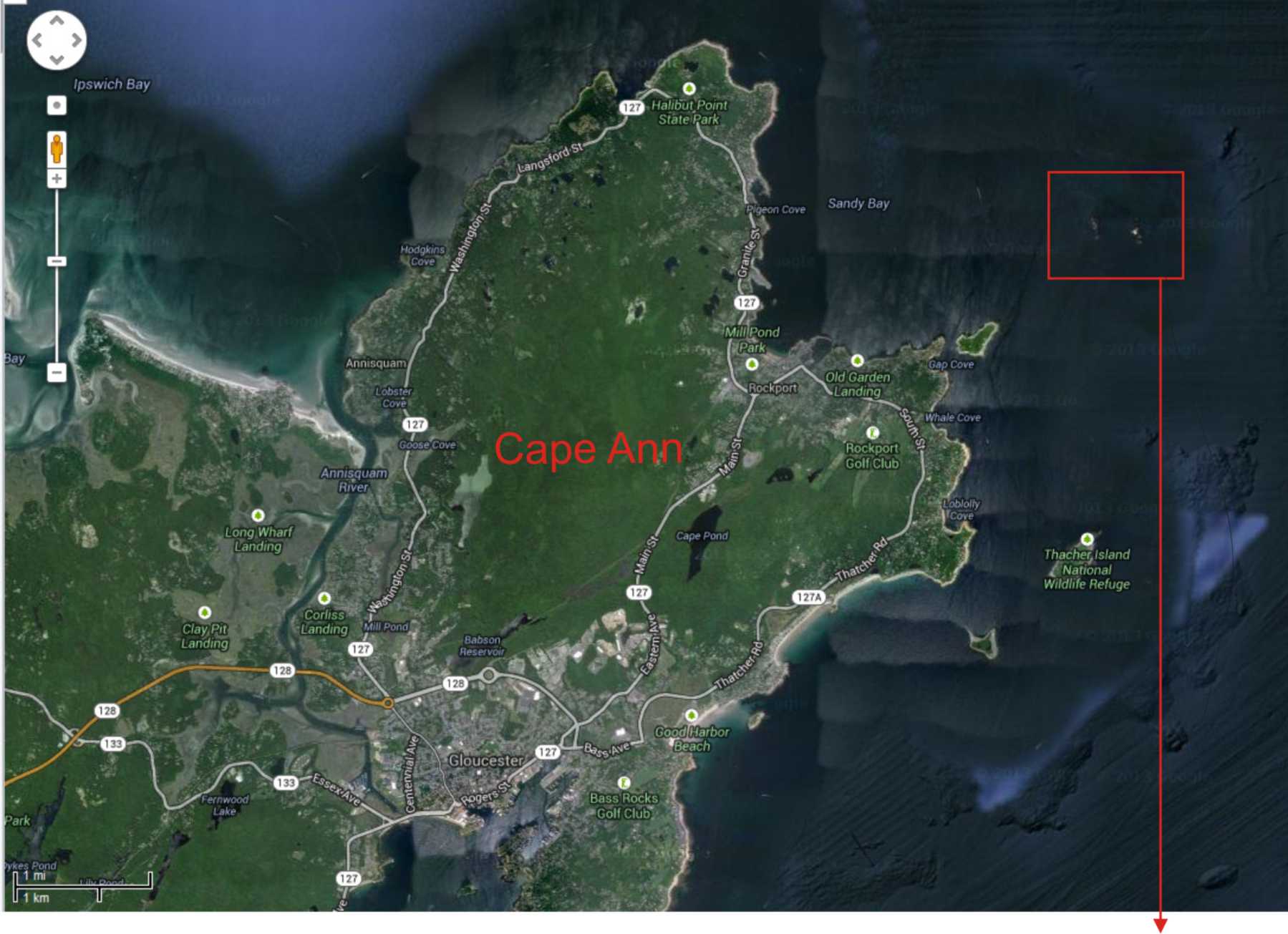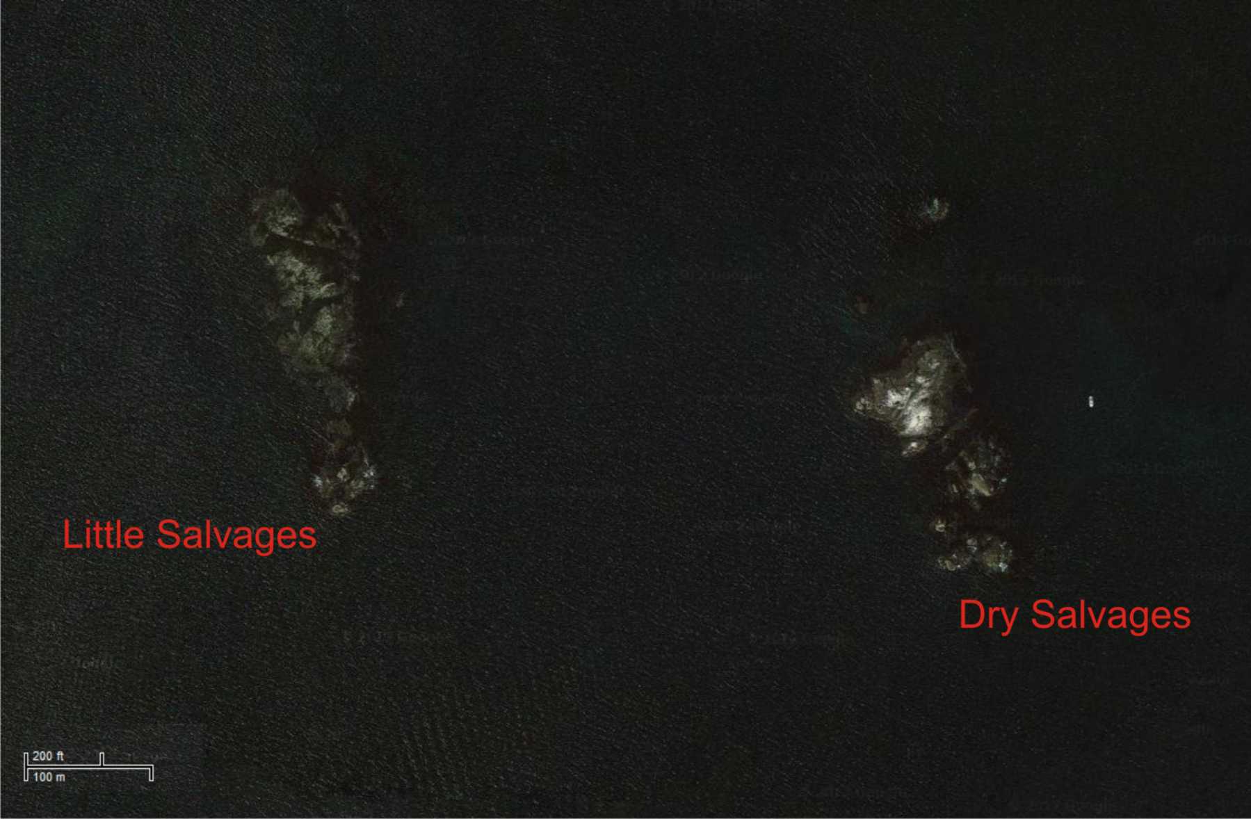 The Dry Salvages are located in the Atlantic Ocean about two miles north-east of Rockport, on Cape Ann, Massachusetts. They are “dry” even at high tide, in contrast to an adjacent, lower reef, the Little Salvages, which are submerged at high tide.