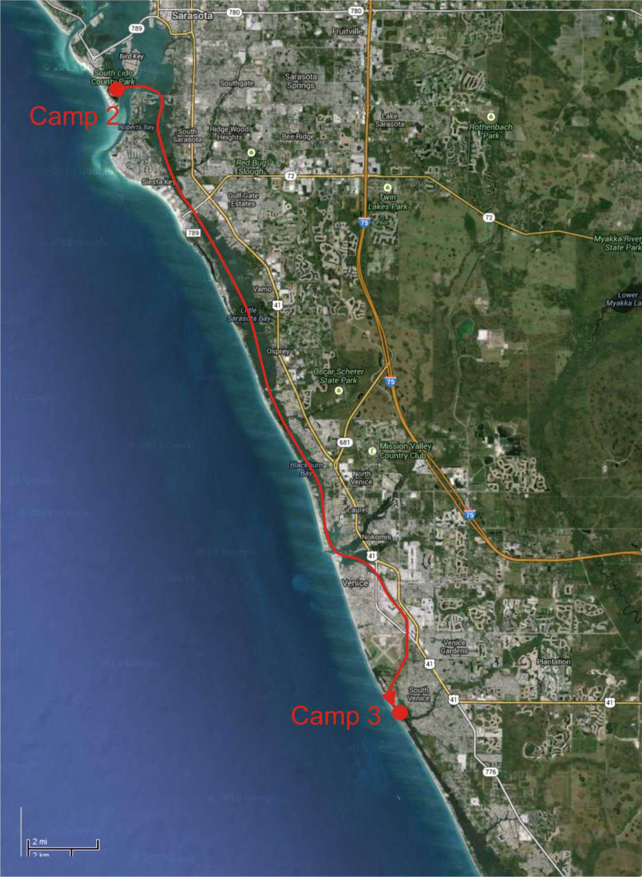 After a few hours, we were on the other side of Tampa Bay in the Intracoastal Waterway, headed south towards Sarasota Bay. Our destination for the day: A county park towards the southern end of Sarasota Bay that we’d identified on Google Maps as a likely camping spot. Even if camping wasn’t technically permitted there, there was a nice sandy beach—indeed, the satellite magic of Google Maps had caught a bunch of kayaks just landed there—and some secluded bays, and we were confident we could find an out-of-the-way spot.
