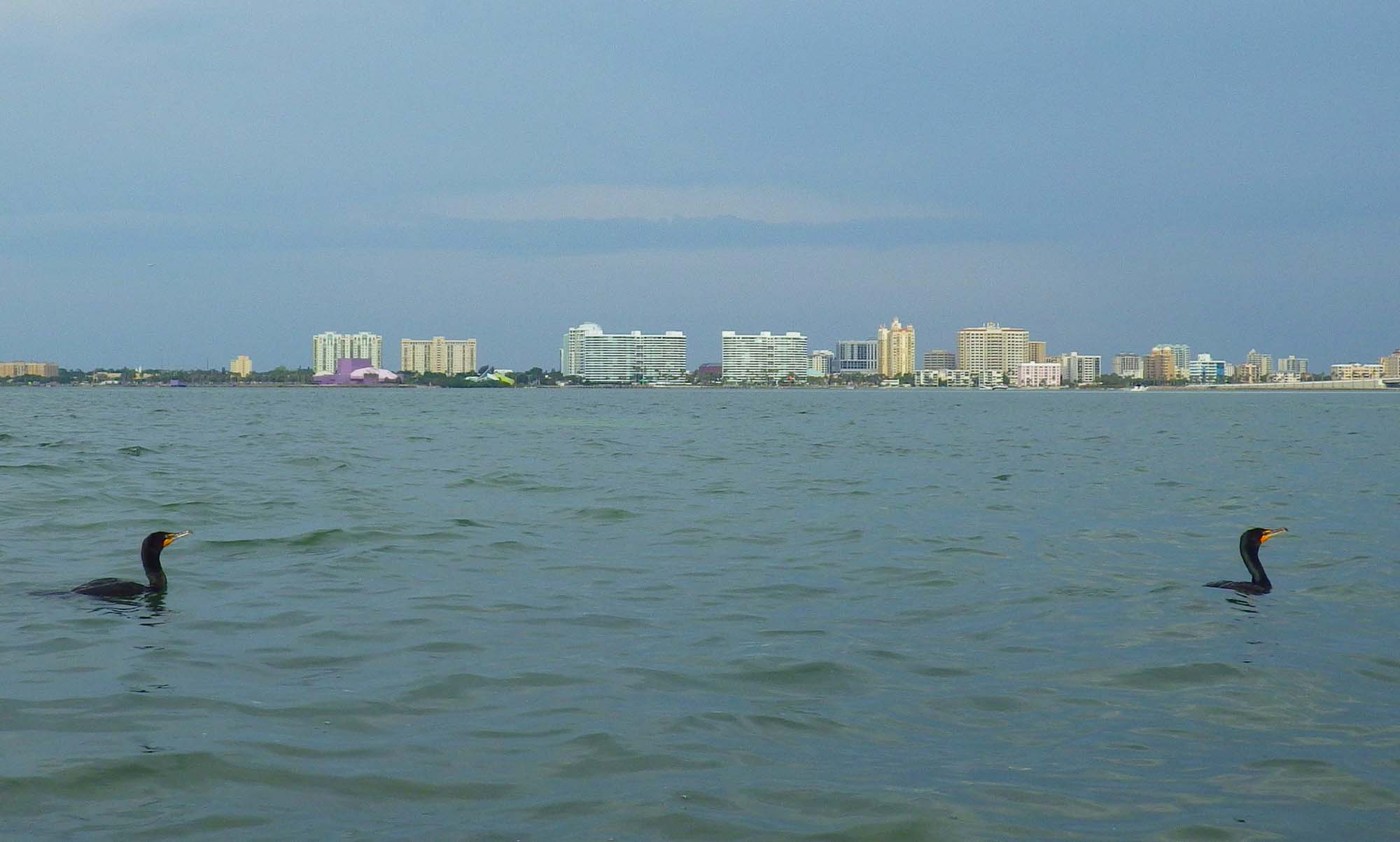 But the birds we’ll remember from Sarasota Bay are the cormorants. As we neared the southern end of the bay, we noticed cormorants surfacing in front of our boats. No surprise there: Cormorants often surface nearby, shake their heads groggily, and eventually launch into flight as we paddle close enough to frighten them.