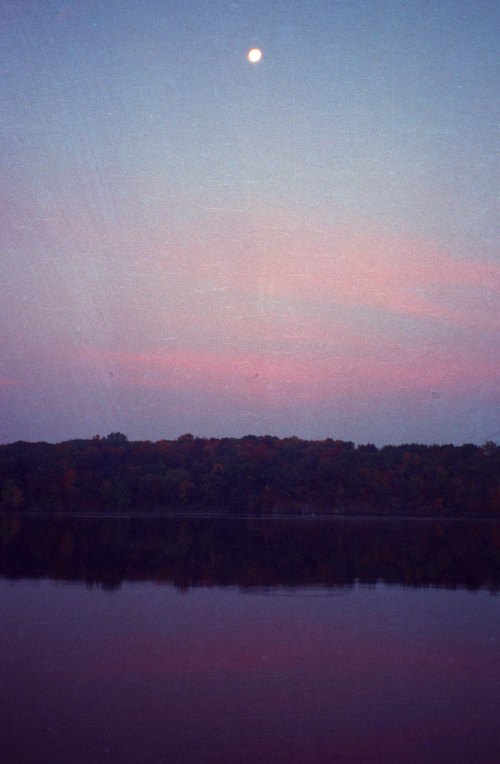 Current now turned to flood; wind still from the south, though dying down. Evening paddle up to campground at the north tip of Stockport Middle Ground. Halfway up saw, from a distance, a fox (coyote?)-like animal on shore. Arrived at campground just in time to see huge freighter move down the channel to the west against the setting sun.