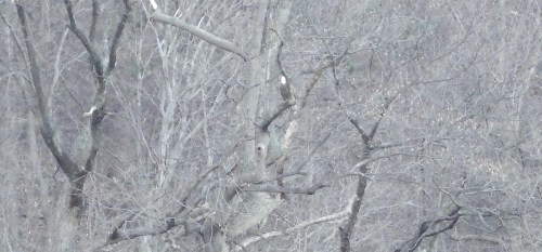We pass a frozen waterfall. Then Richard spies something in a tree. “Is that a bald eagle?” he asks.