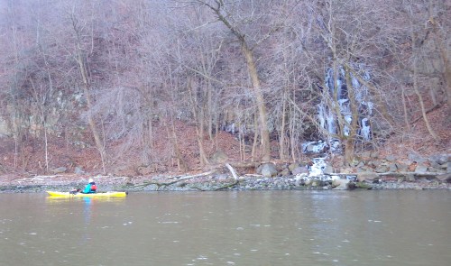 Brian paddles close to the bank to inspect another waterfall. This one leaps majestically from the cliffs, frozen in cascades of ice. Even though the day is warm, the ice warns us of winter to come.