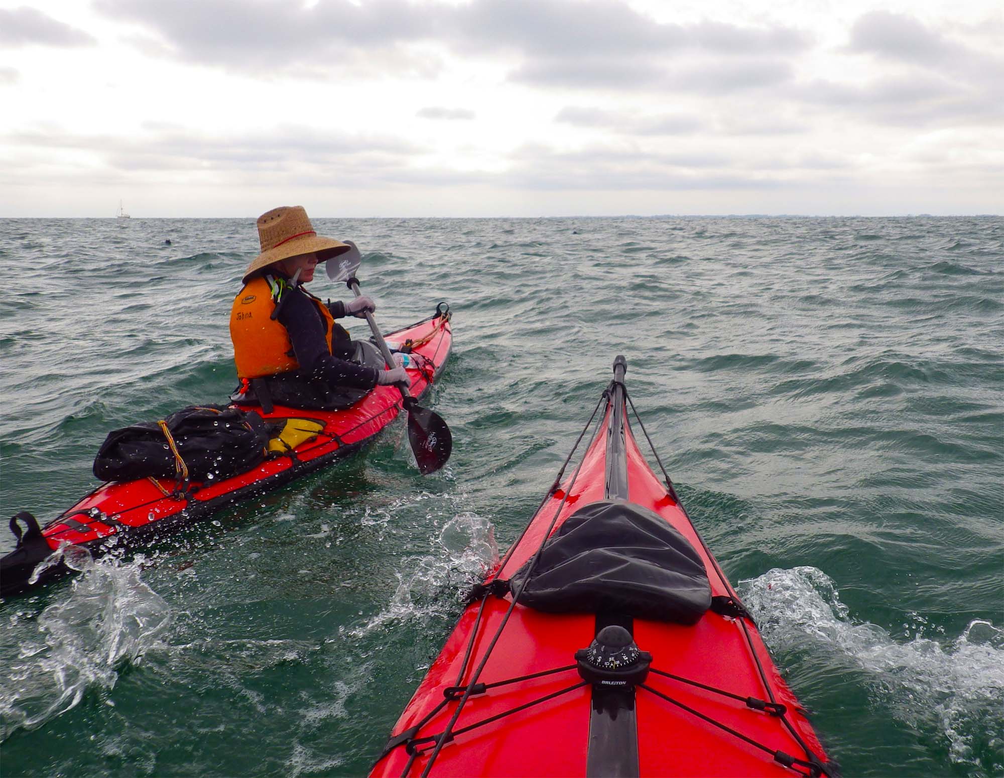While the water appears very calm, there were very dynamic eddies, boils, and swirls that moved our kayaks substantially; about 2/3 of the crossing was in the fog using GPS and deck compasses.