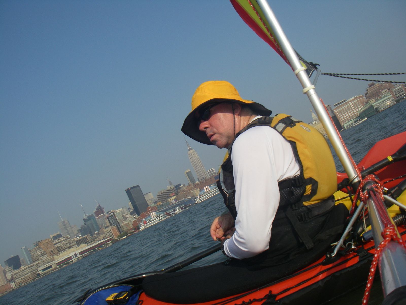 Here’s a photo of me sailing my kayak through New York Harbor—that’s the Empire State Building in the distance—back in 2007. The camera, set to take a photo automatically every 10 minutes, was mounted on the outrigger arm, but evidently not very firmly: it started rotating round it, so that when I got home, I found I had photos tilted at all angles, even some upside down…