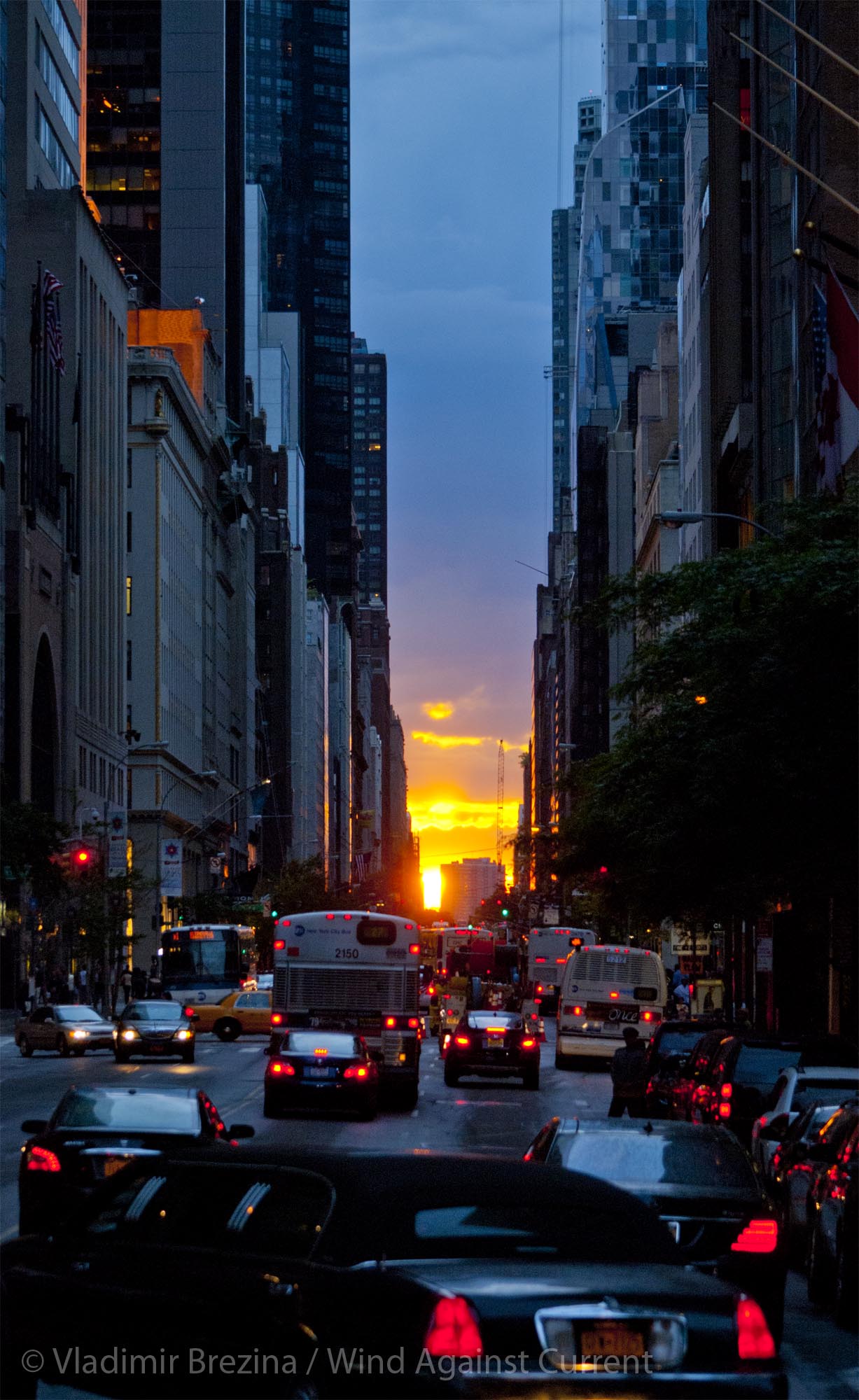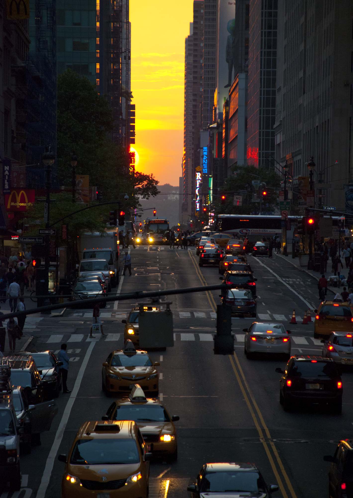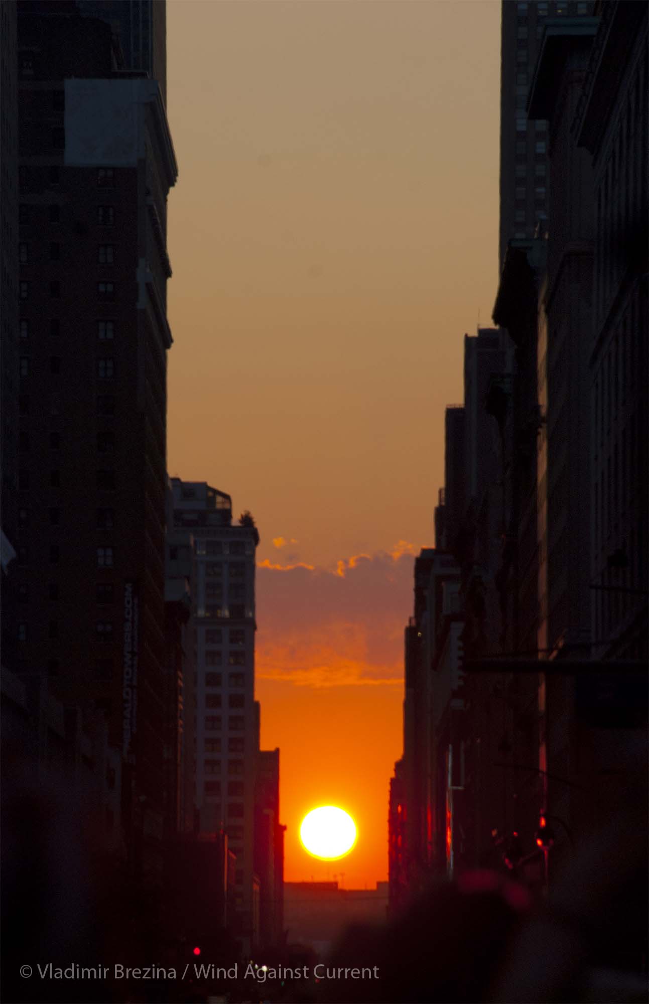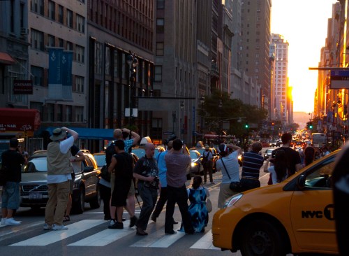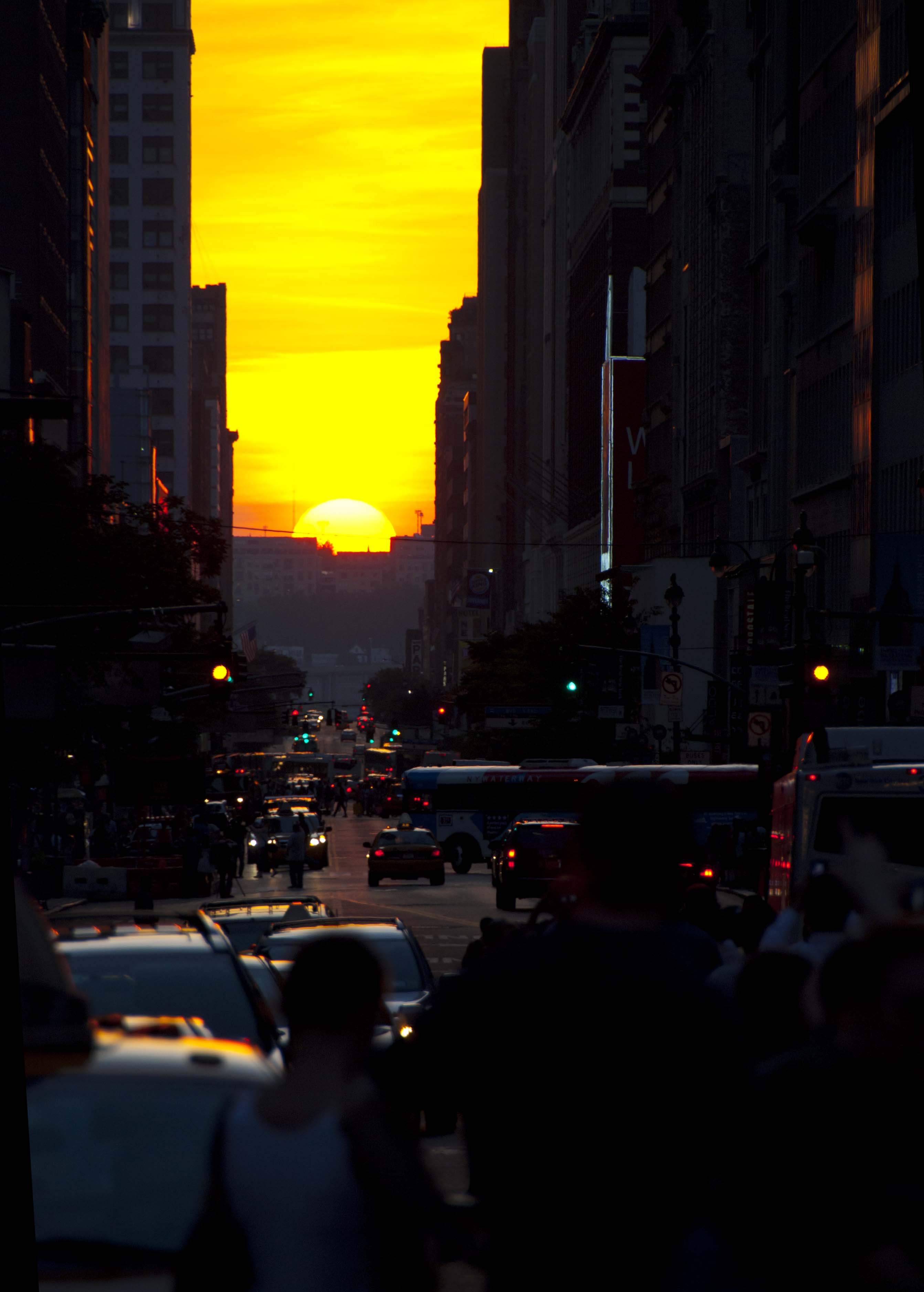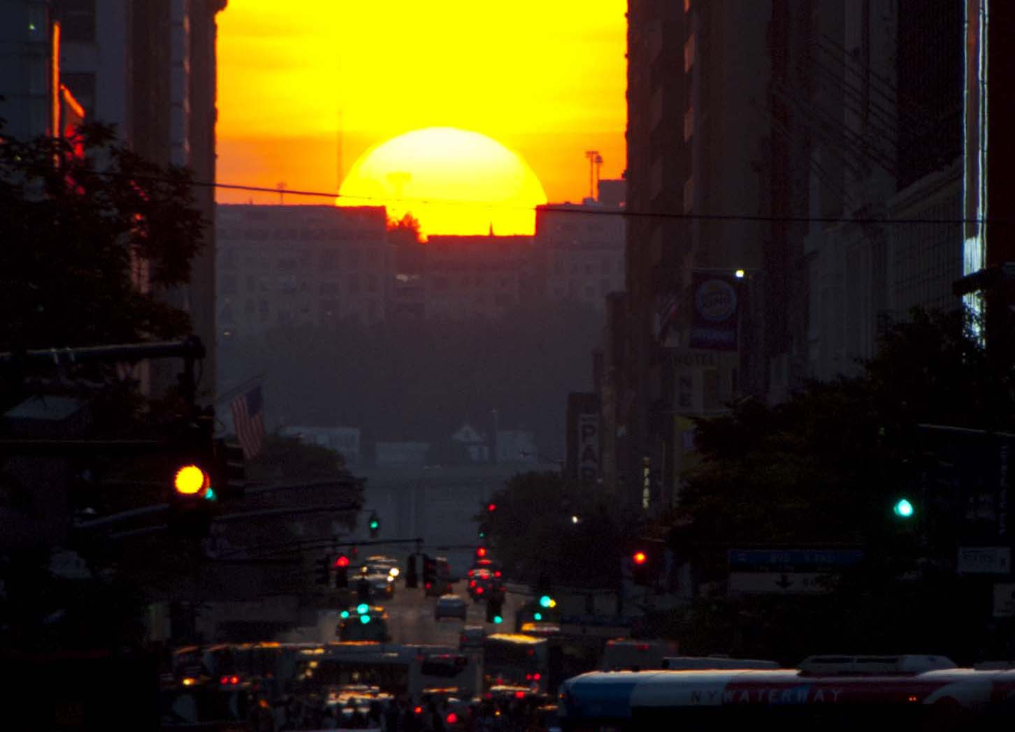 It’s a well-known phenomenon, and has become more so with each passing year. Photographers gather at major intersections, awaiting that perfect moment when the sun touches the horizon, framed precisely between buildings on either side. For a moment or two, the sun is a celebrity.