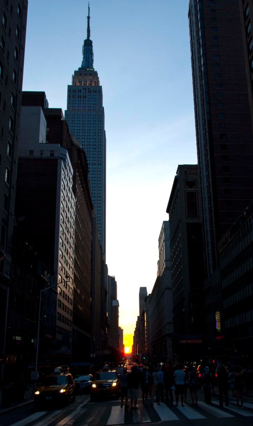 For yesterday and today were days of Manhattanhenge, that urban astronomical phenomenon in which the sun appears, for a brief moment just at sunset, at the ends of the cross-streets of Manhattan’s street grid.