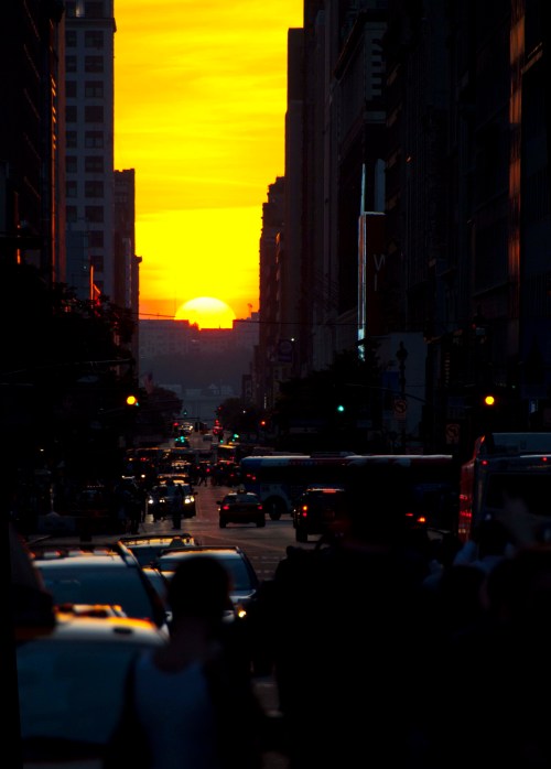 It’s Manhattanhenge! On two days in the year, for a brief moment before it sinks below the horizon, the setting sun is perfectly aligned with the cross-streets of Manhattan’s rectangular street grid and sends its last golden rays straight through its canyons…