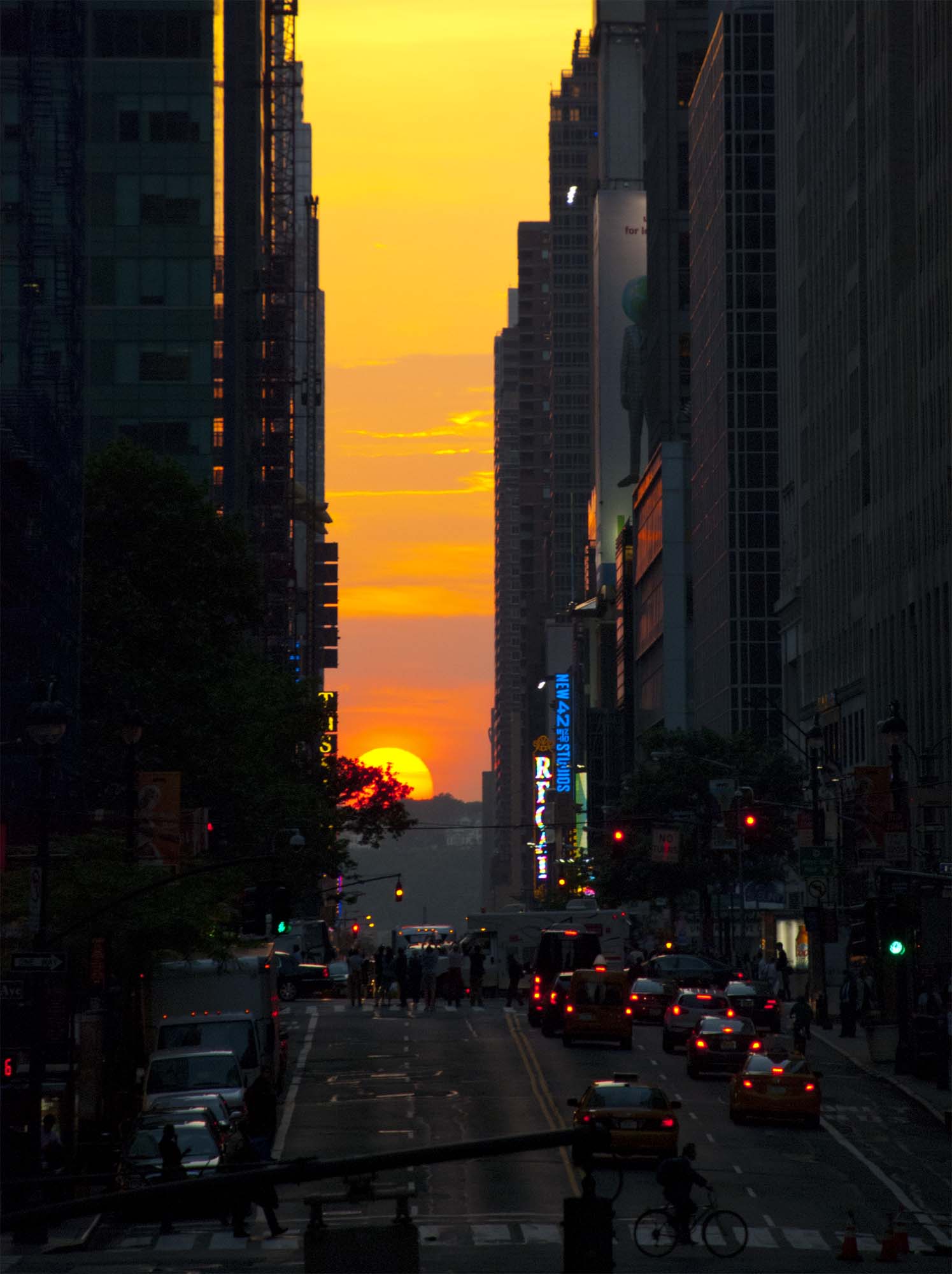 So Manhattanhenge proper—when half of the sun’s disk would have appeared on the horizon at the end of the cross streets at sunset—was actually yesterday, May 28th. But it was cloudy. And anyway, from Midtown Manhattan it’s not really possible to keep the sun in sight as it sinks all the way down to the horizon. New Jersey is in the way.