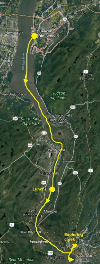 Launched by 10:00 a.m. Paddled south against the current into Haverstraw Bay, then along eastern shore and across to Croton Point. 10-kt tail wind and 1-ft following seas (whitecaps in main channel), both increasing significantly alongside Croton Point and south into the Tappan Zee. Some icing on the boat from freezing spray.