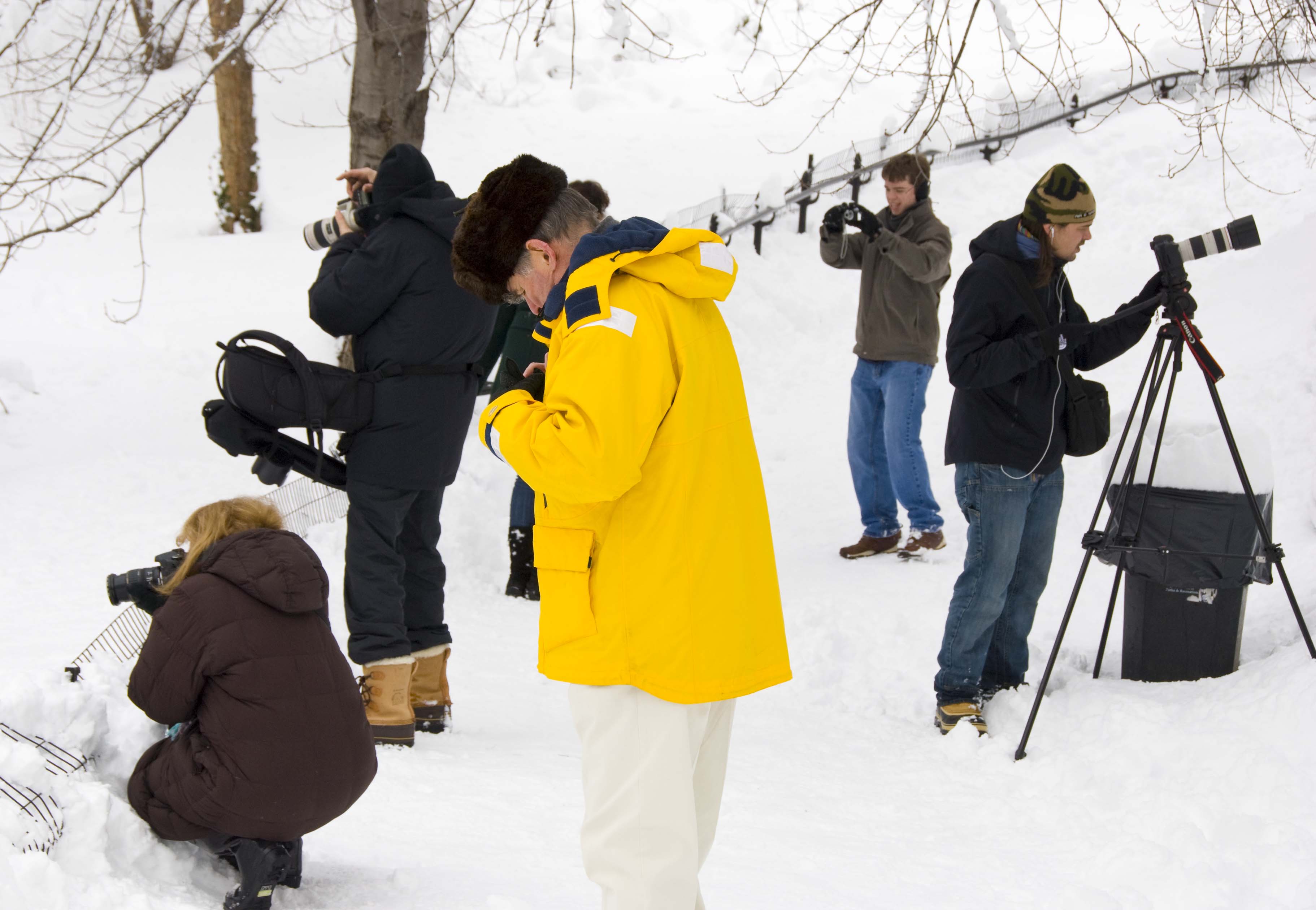 Heavy snowfall in New York City’s Central Park on January 27, 2011. The photographers were out in force, photographing ducks congregating around the last patch of unfrozen pond water. Against the pristine white snow, the ducks stood out in brilliant colors. As did some of the photographers! A vivid reminder why yellow is a good color to wear if you want to be noticed… More photos are here.