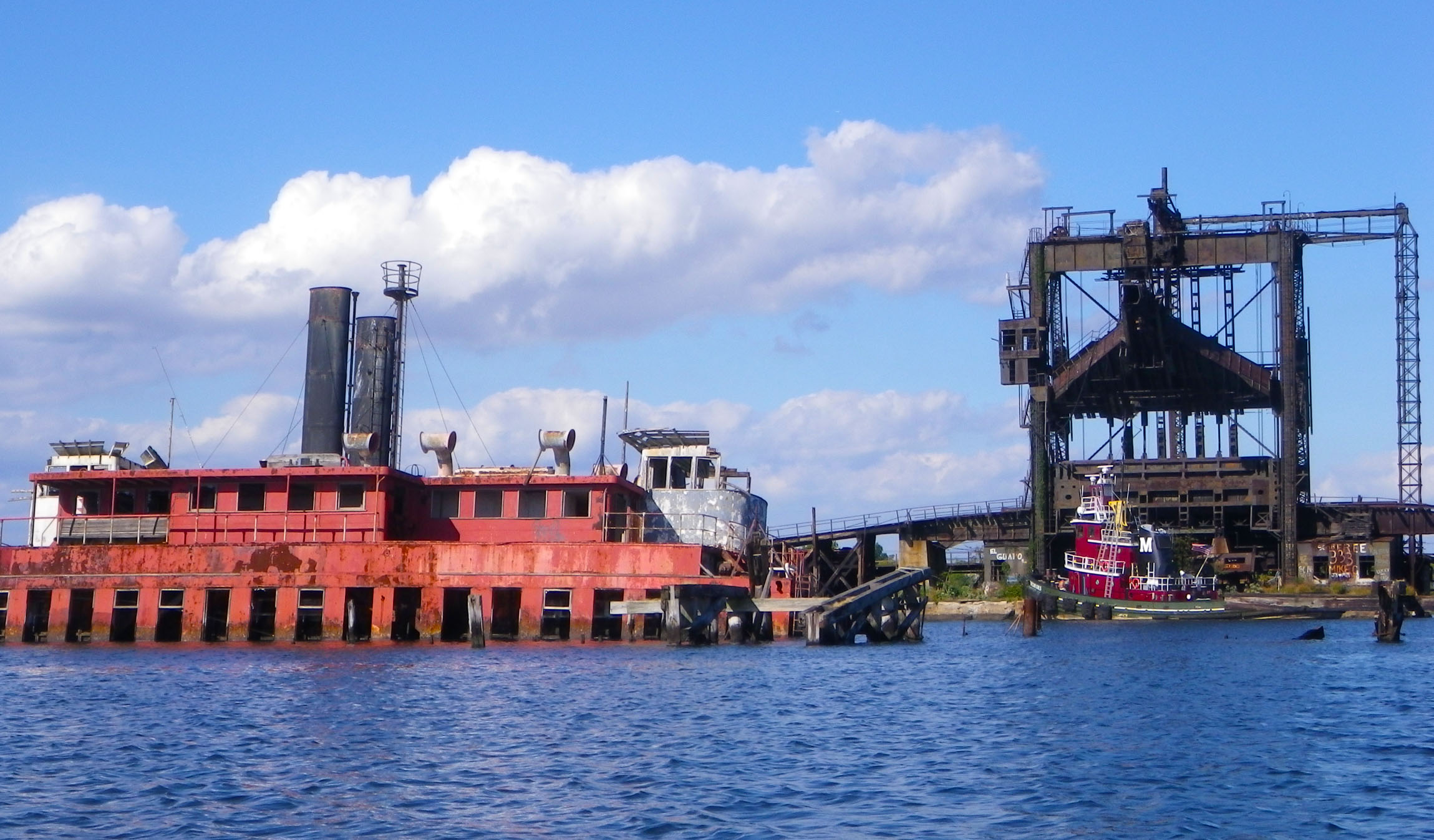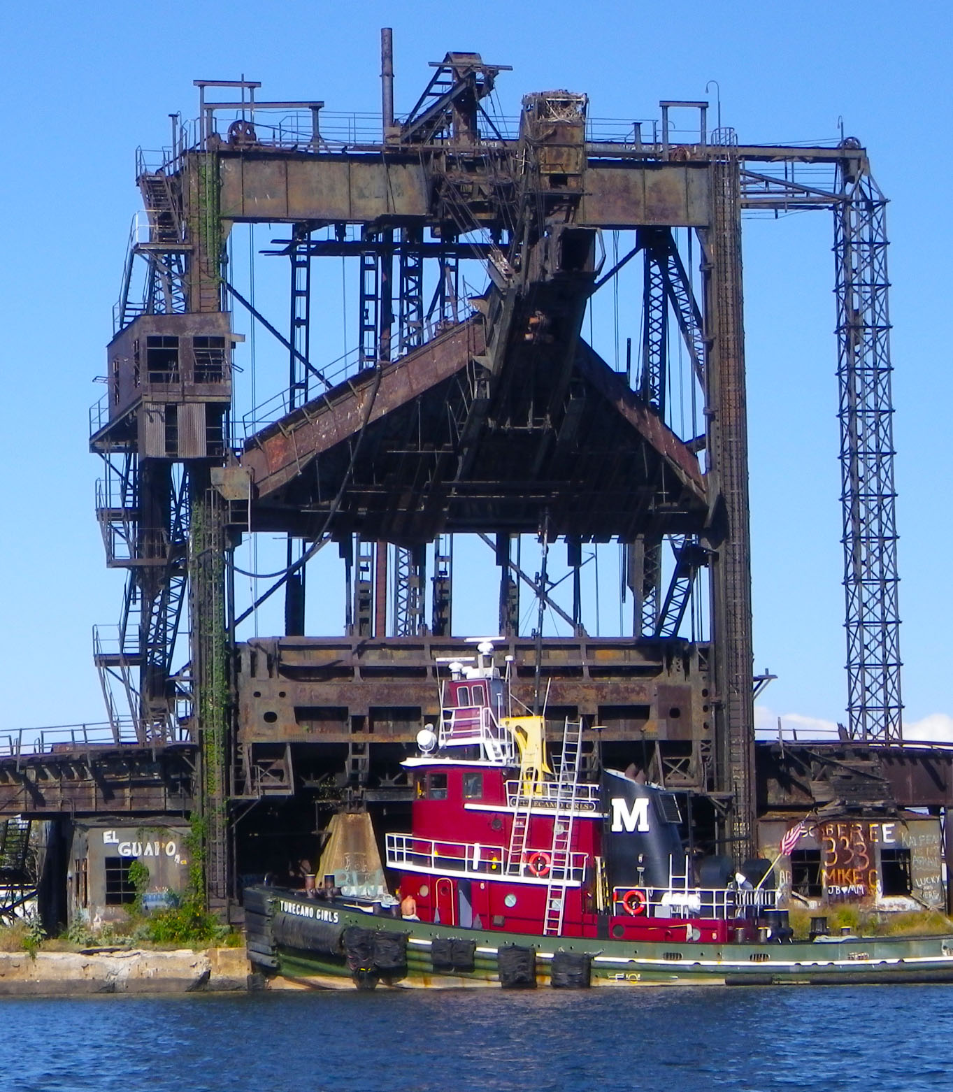 In operation, an open-topped railroad car full of coal was pushed into position inside the unloader’s tower. It was then grasped by the machinery, bodily lifted up, and turned upside down so that the coal spilled down a chute into a waiting barge (moored about where the tug Turecamo Girls is moored in the photos above). The empty car was put back onto the rails and given a little shove, so that, like on a roller coaster, it rolled away by gravity down an incline while the next full car was pushed into position…
