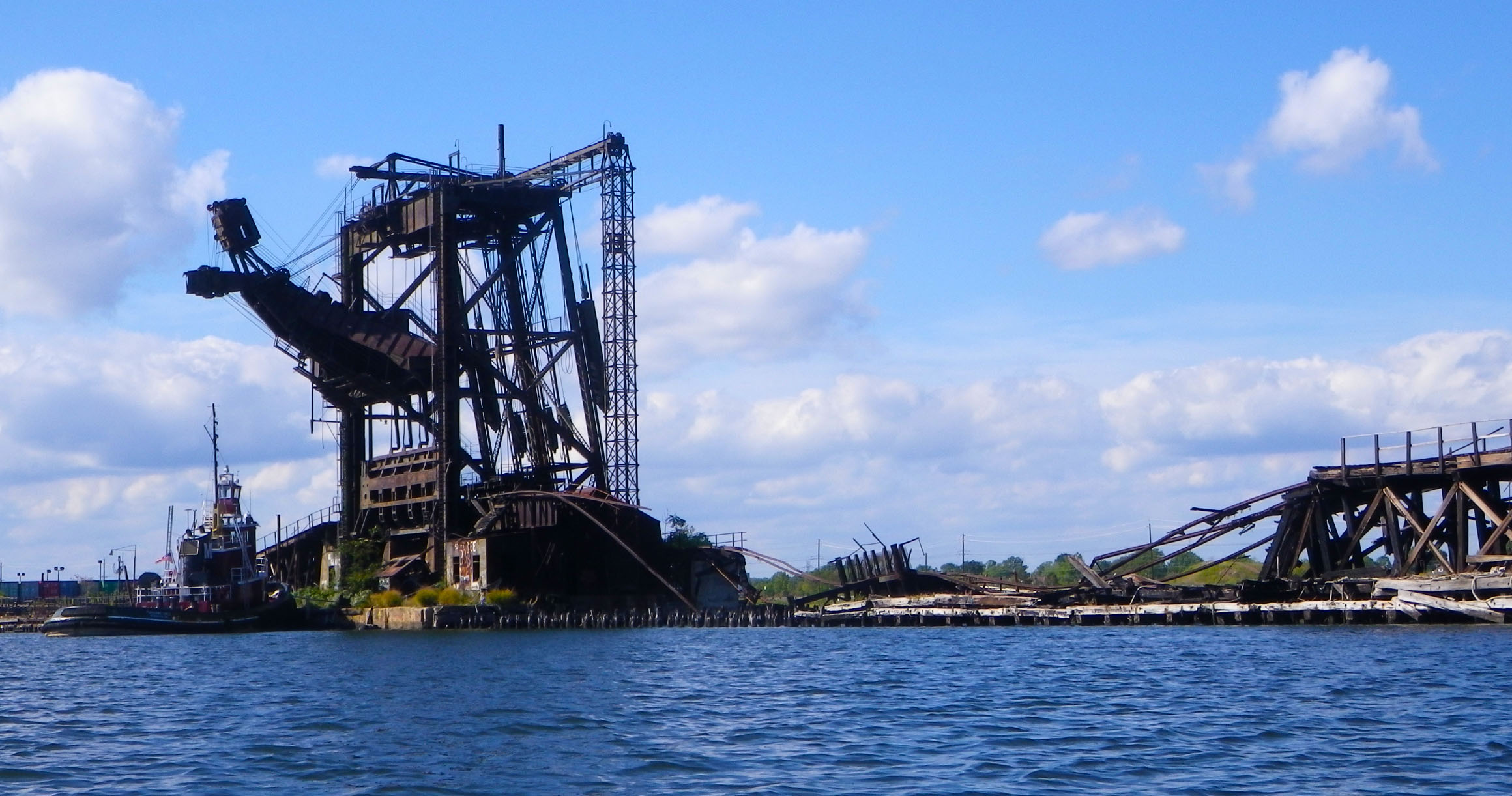 It’s a McMyler Coal Unloader. Built in 1917 and operating until the 1970s—according to some accounts, until 1983—it’s the last remaining one of its kind in the New York area. Originally there were at least eight of them along the shoreline of New York Harbor, each operated by one of the railroads that brought coal in from Pennsylvania and the Alleghenies. One, described in loving detail here in a 1951 article, apparently was located on Jersey City’s Pier 18, a now completely vanished 900-foot quay extending into the Hudson River between Liberty and Ellis Islands!